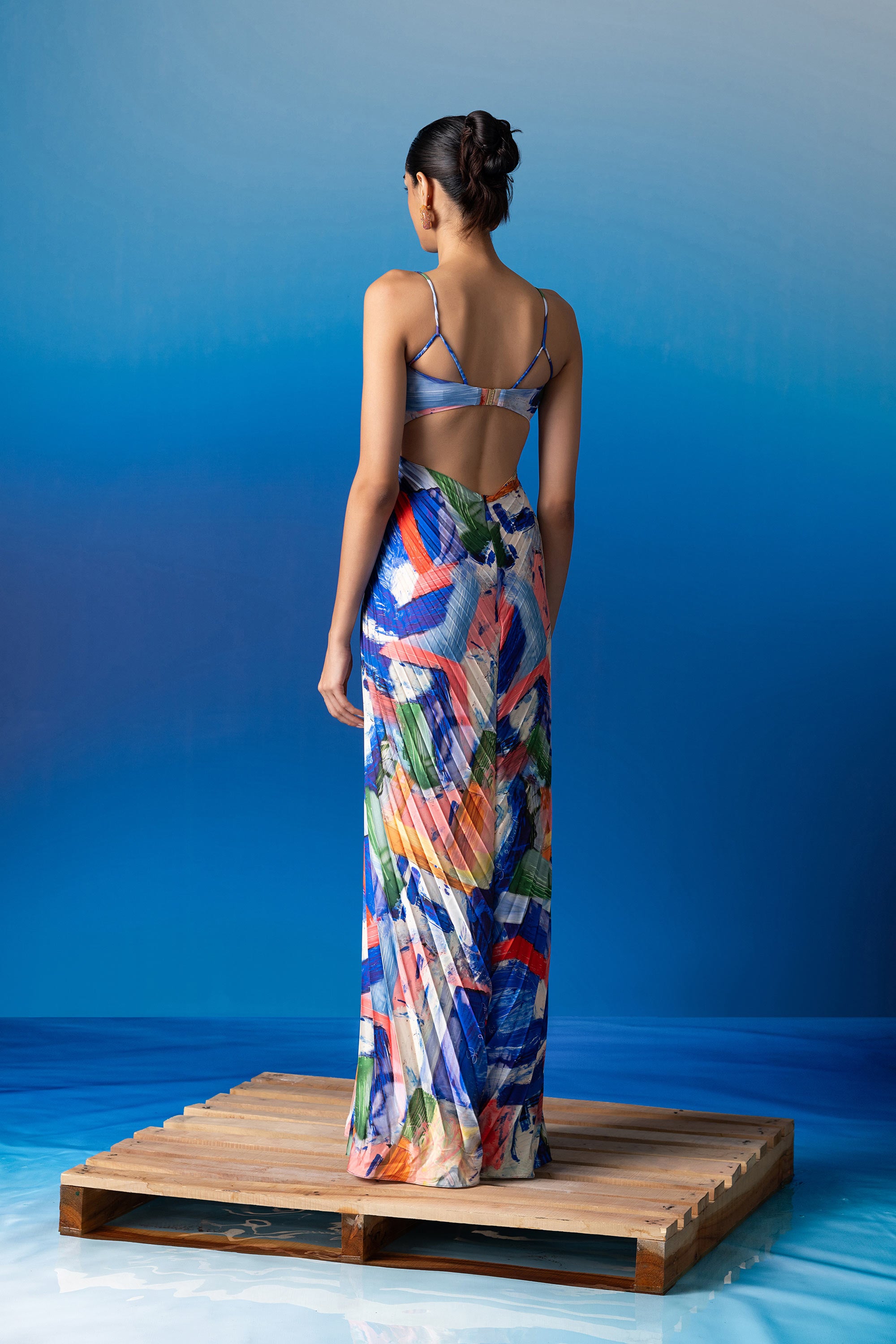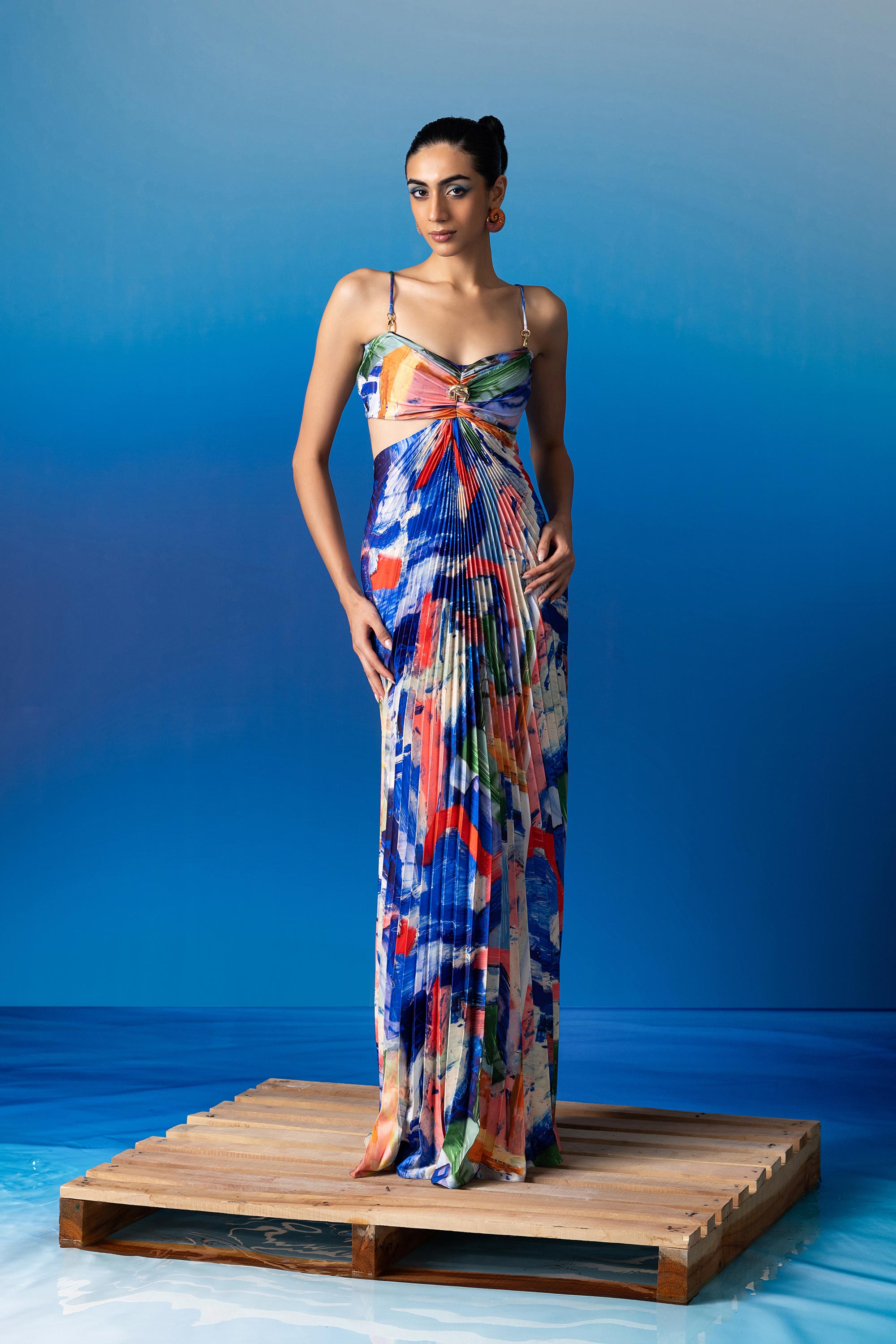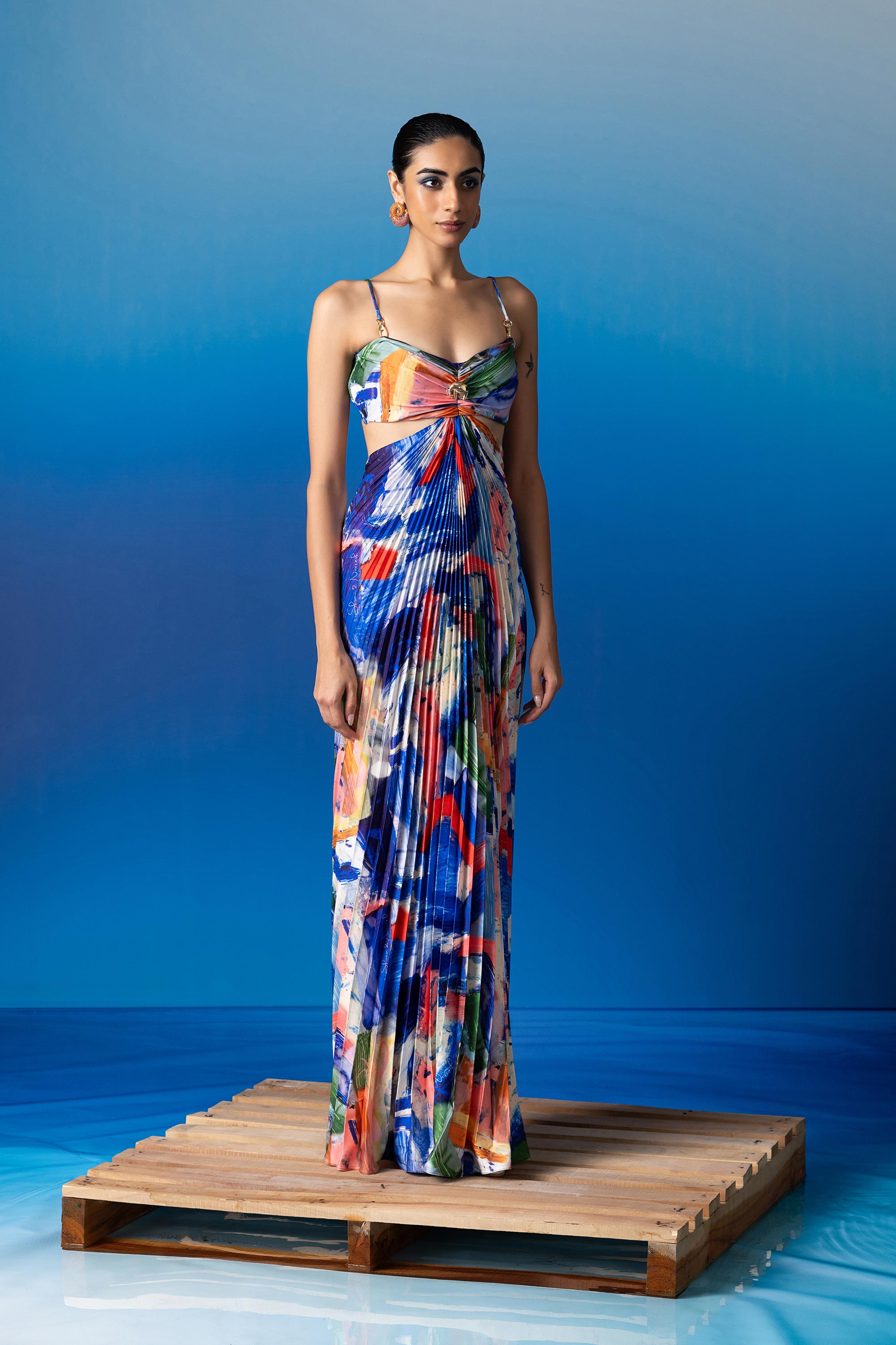 The Foxfires Pleated Cut-Out Maxi makes a beguiling statement in polyester satin. The fine thermal pleats add charm notes to this resort must-have with a knotted bandeau bodice finished with the signature saf trim.