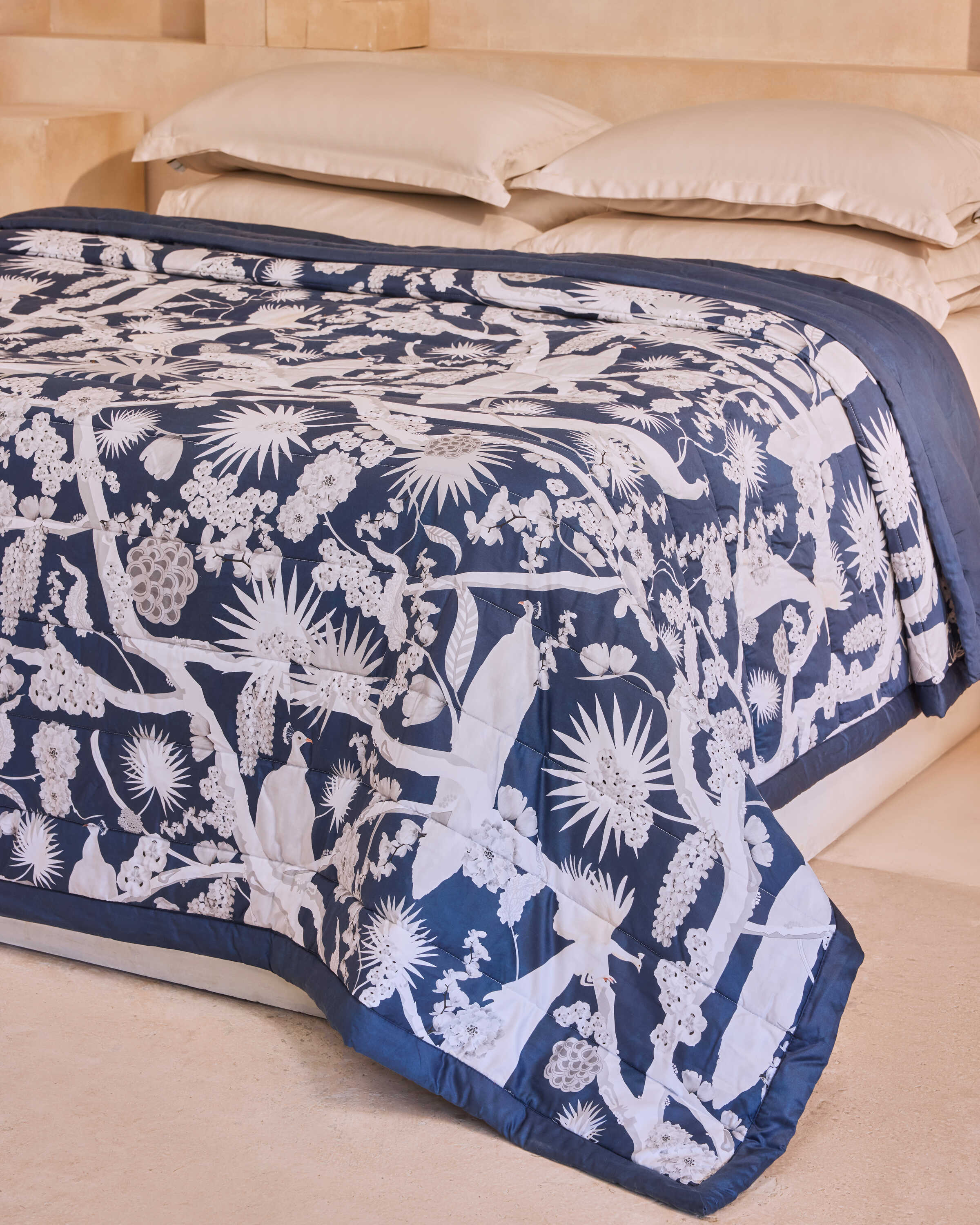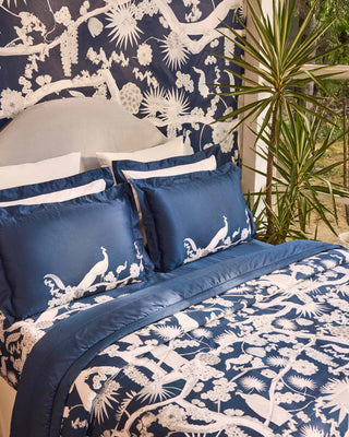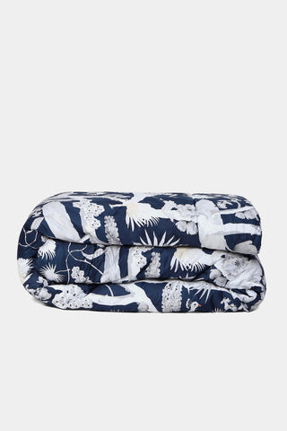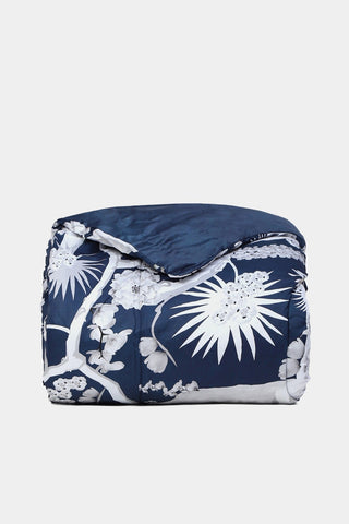Inspired by Japanese aesthetics, the Izu Juno Comforter adds style to any bedroom with its iconic art print on one side and sapphire hue on the other from the SHIVAN & NARRESH for myTrident Bed & Bath Collection. Made from 100% cotton with a 400 thread count, this reversible comforter lets you easily change up your room's look. It also includes a matching tote for storage, blending style, comfort, and practicality with serene sophistication.