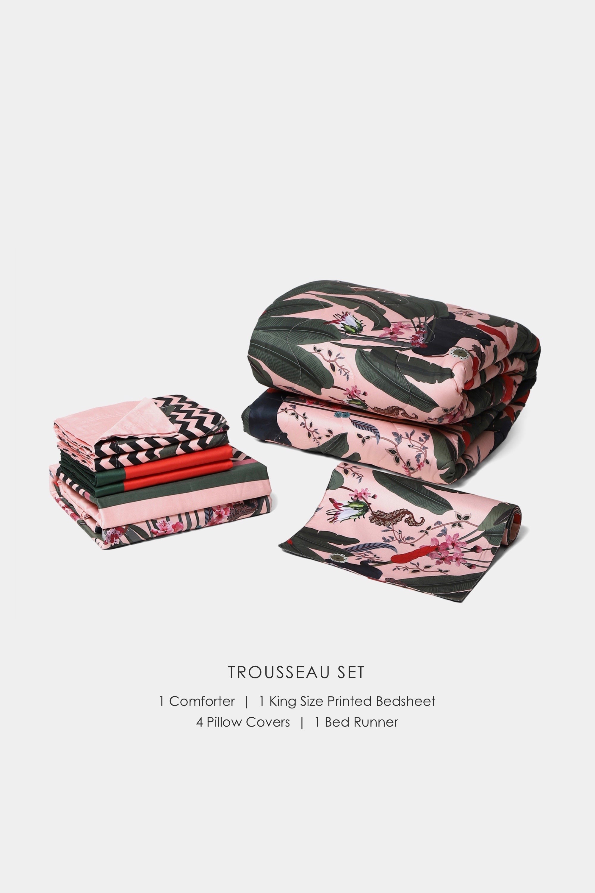- Trousseau Set- 1 Comforter - 228 x 274 CM; 1 King Size Printed Bedsheet - 274 x 274 CM; 4 Pillow Covers - 46 x 69 CM