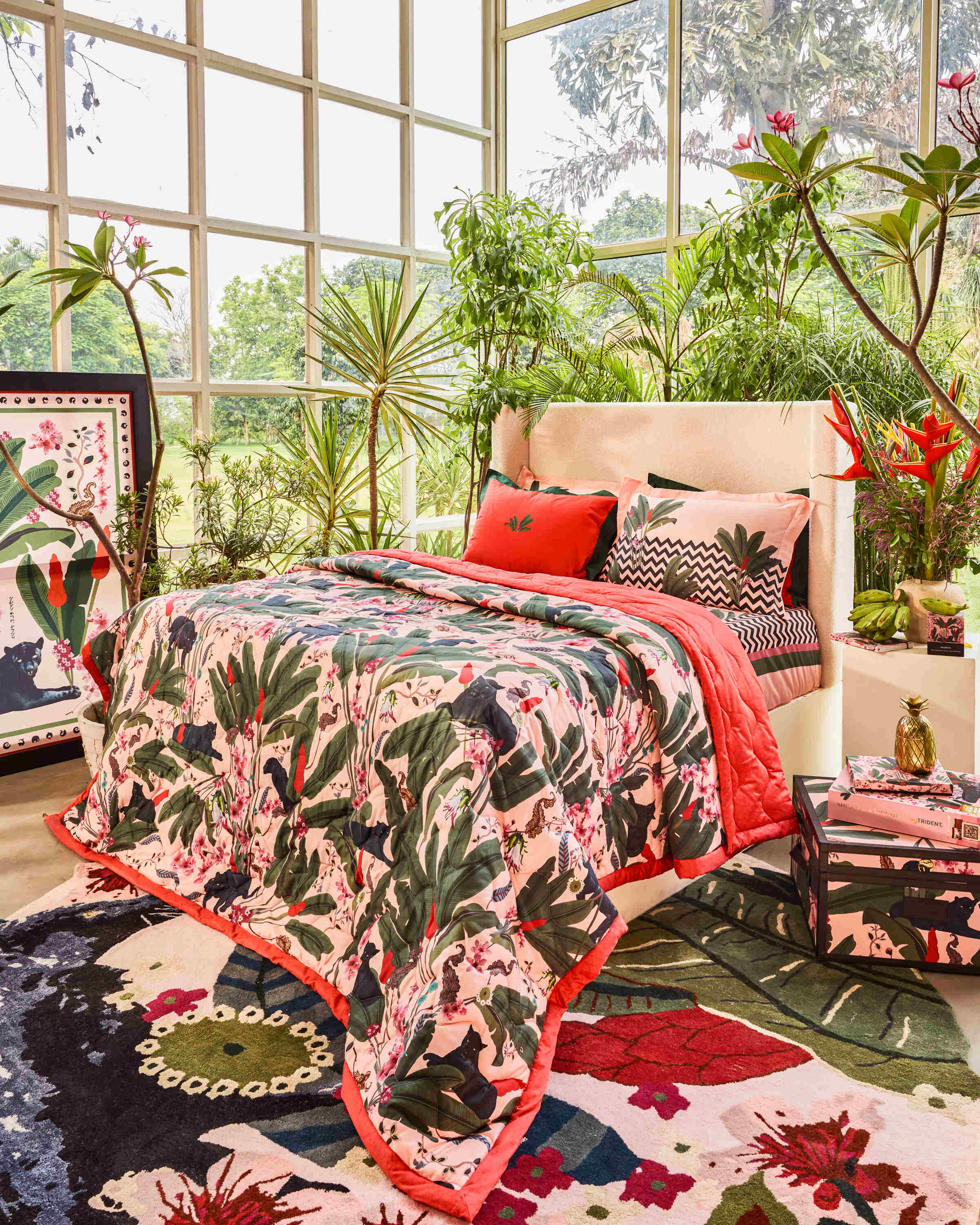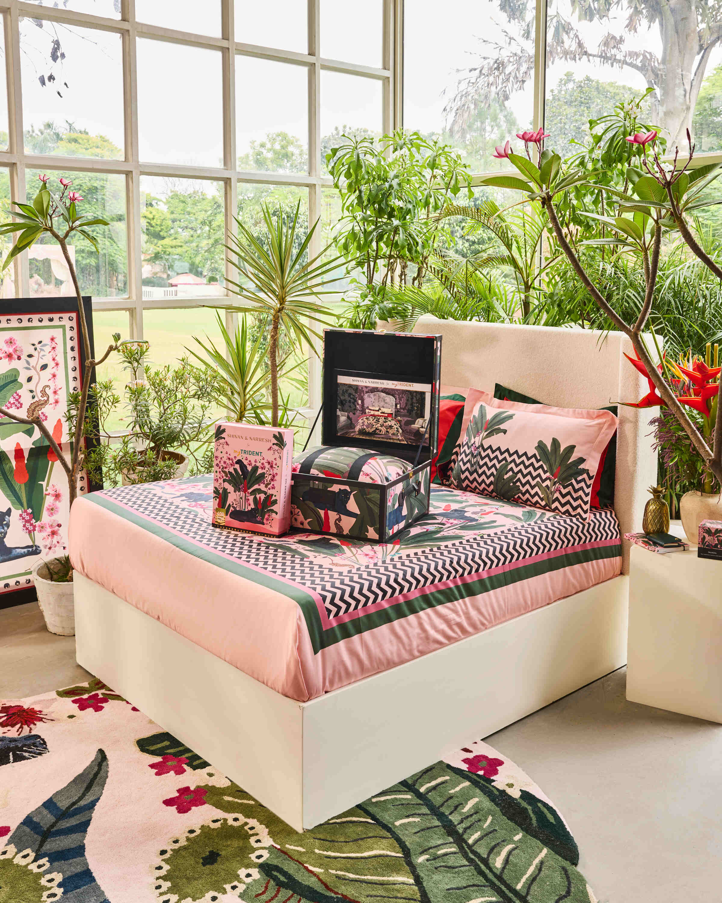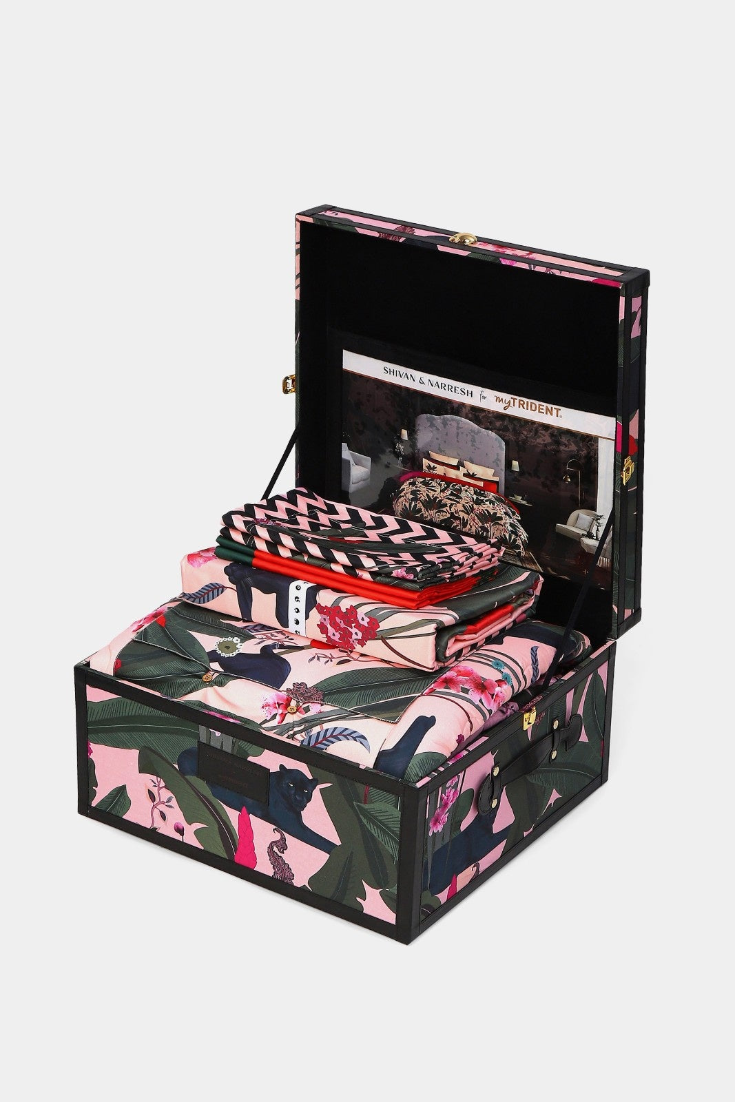 Introduction Palmera Trousseau Box from the SHIVAN & NARRESH for myTrident Bed & Bath Collection. This exquisitely crafted wooden box, featuring the Palmera art print includes a comforter, a king-size printed bedsheet with four pillow shams, and a bed runner, serves as both a stylish storage solution and a stunning decorative piece. Ideal for gifting on special occasions or as a beautiful addition to your own home, this box offers a thoughtful touch of sophistication.