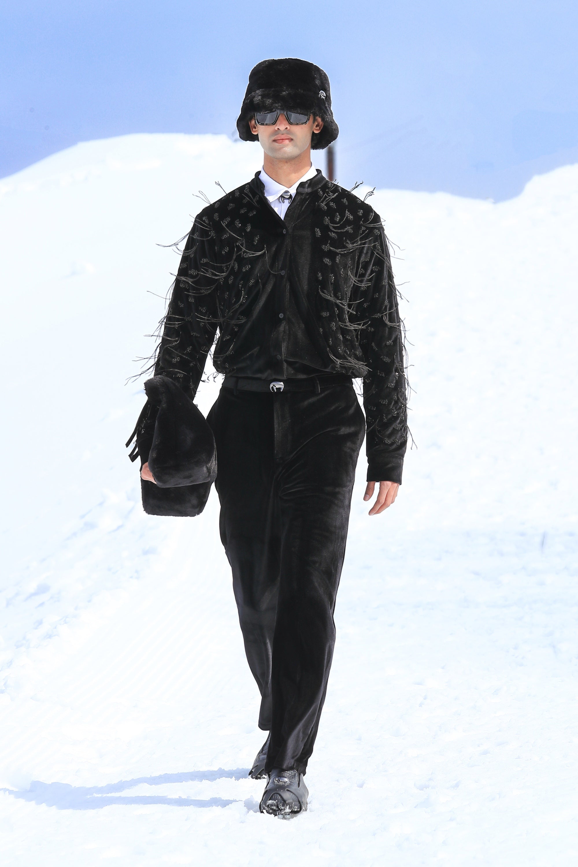 Crafted in rich black velvet, this set delivers bold texture for après-ski glamour. The tailored shirt-jacket is adorned with feathers and glassbeads, offering a statement piece that blends sophisticated comfort with luxurious evening tailoring. It is paired with coordinating velvet pants showcasing the signature chrome saf belt.