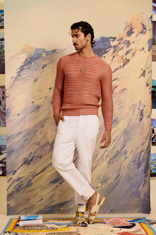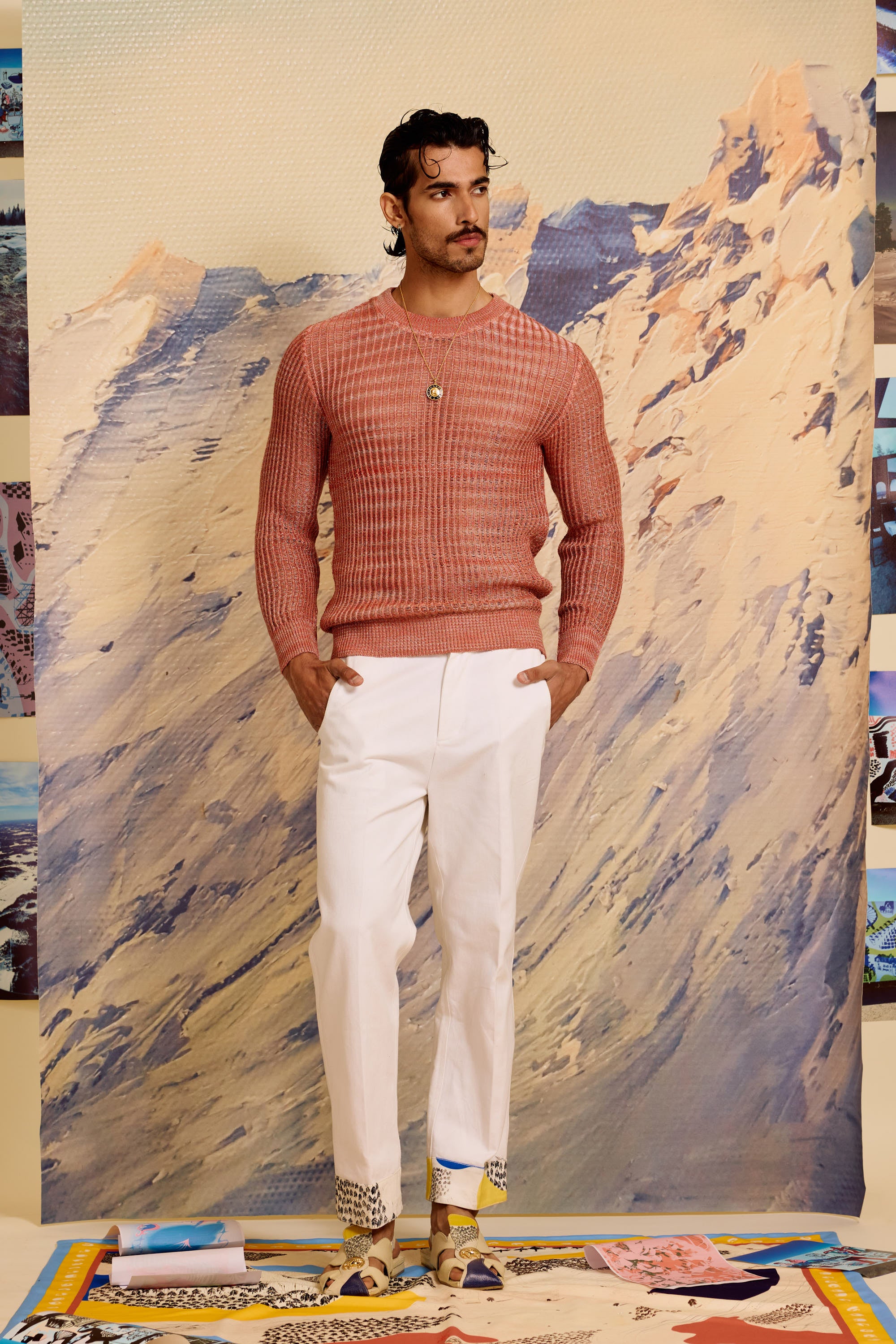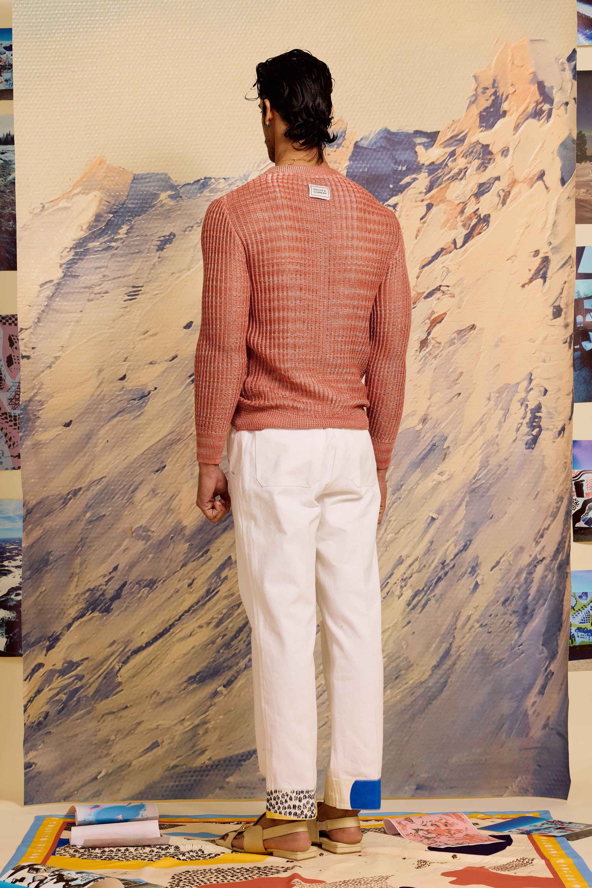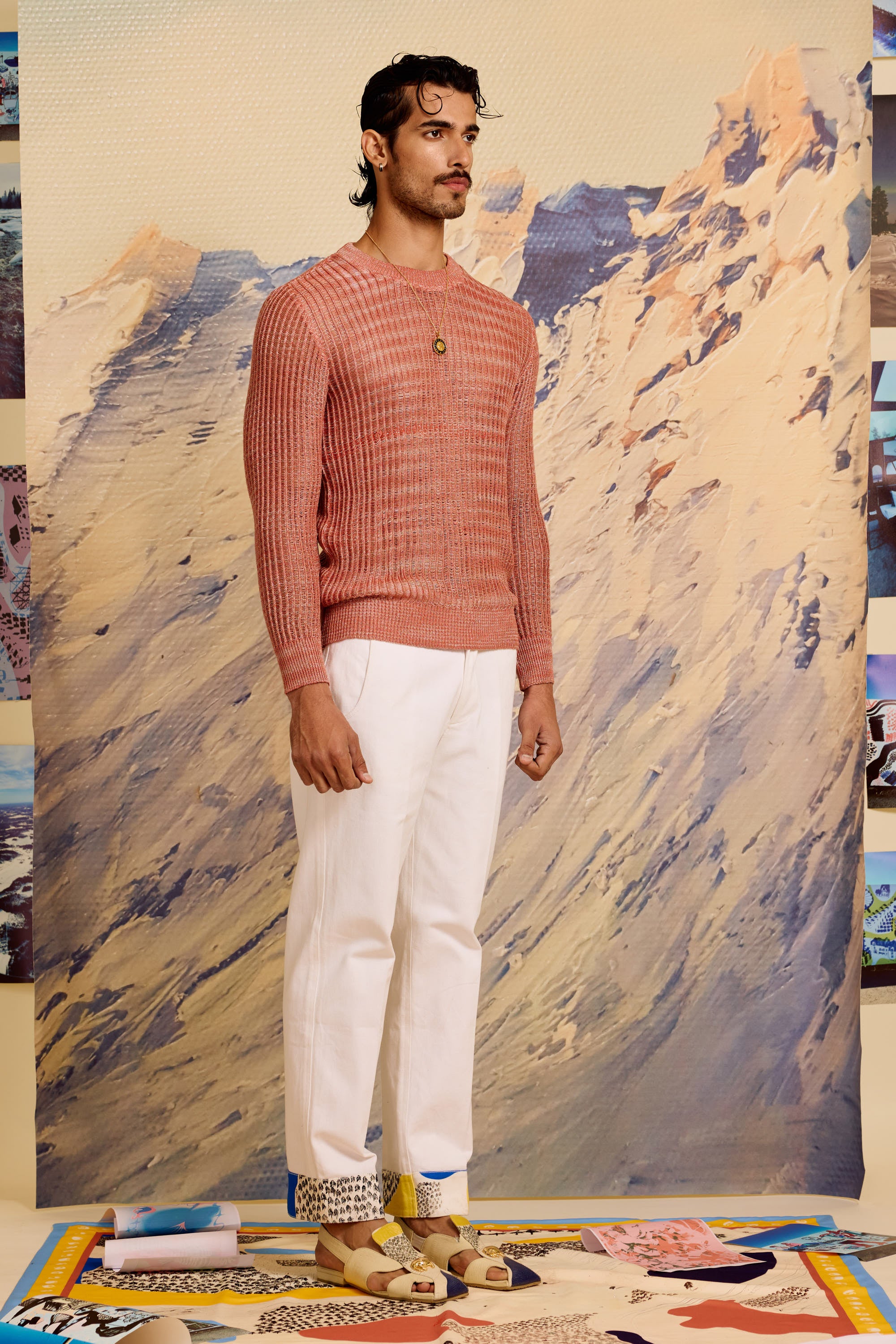 Salmon Ombre Knitted Jumper is an easy way to add texture and pattern to your outfit. It's knitted from fine cotton yarn blended with metallic thread and finished with ribbed hem & cuffs. Wear under jackets or by itself with printed resort trousers, the look transitions from edgy formal to moody resort.
