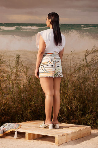 Channel retro feels with this exquisite playsuit featuring a flattering silhouette, finished with lace trimmings. The shorts feature Saun print in fine jersey, adding a layer for comfort for the wearer. The look is finished with a chrome Saf on the belt, making the piece a delight to flaunt.