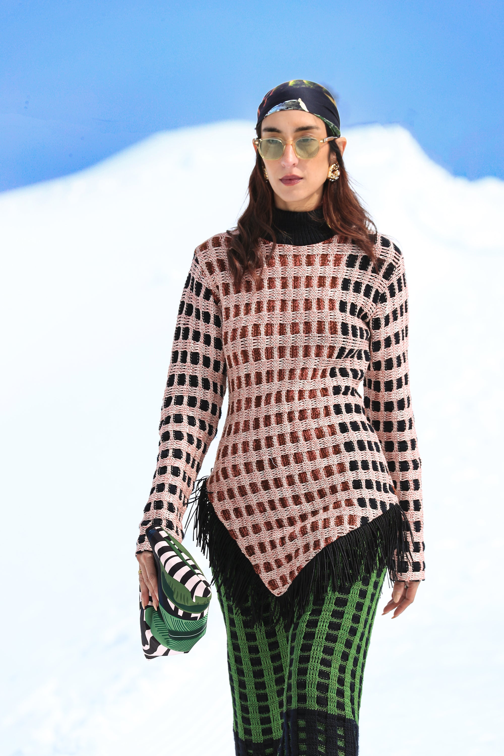 Extend your knitwear collection with the Blush Checkered Knit Top. Enveloped in waffle knit and fashioned in tones of blush and noir, the top is accented with fringes on hem. It is layered over contrast waffle knit trousers creating a bold, artisanal statement crafted for elevated winter glamour.
