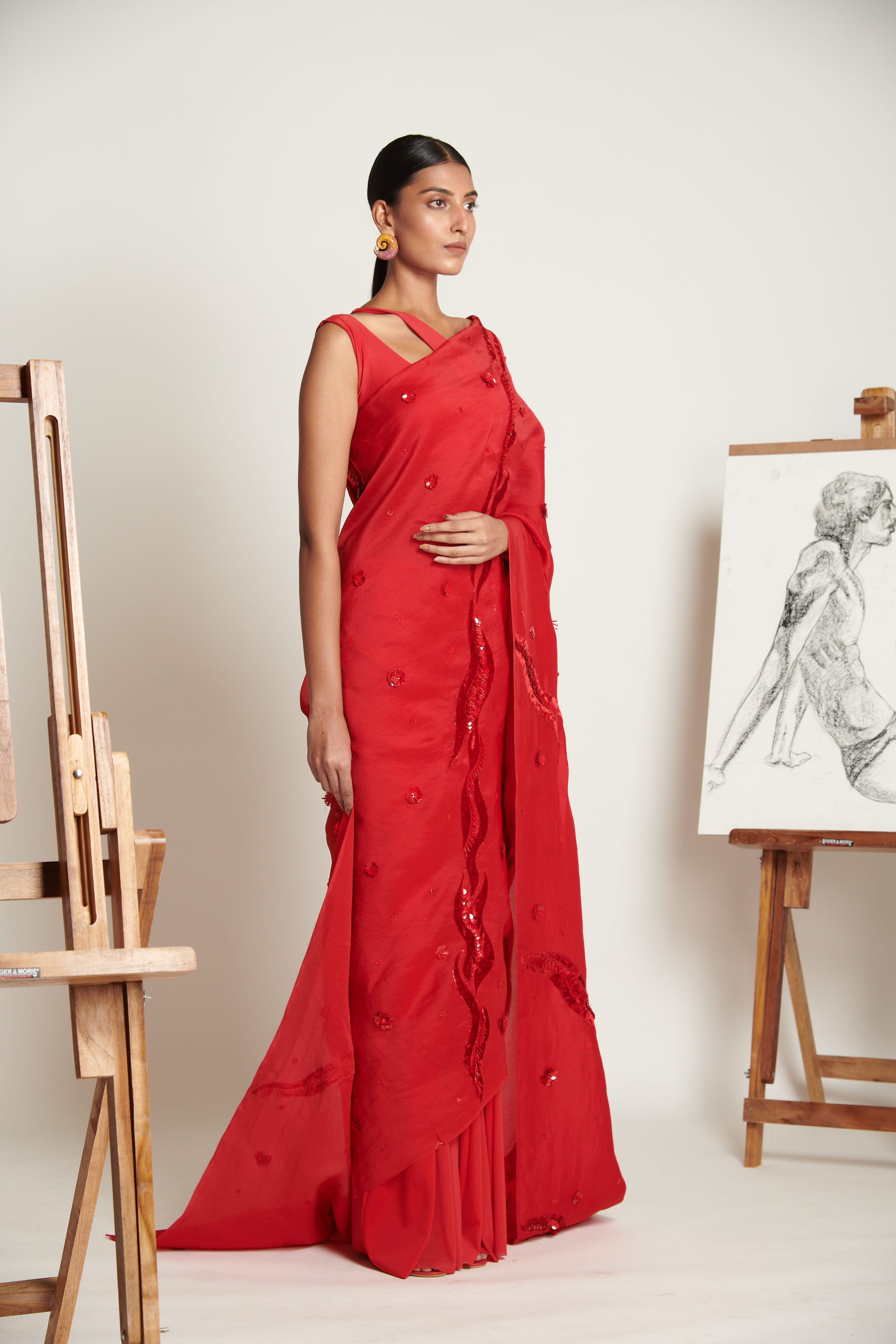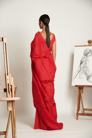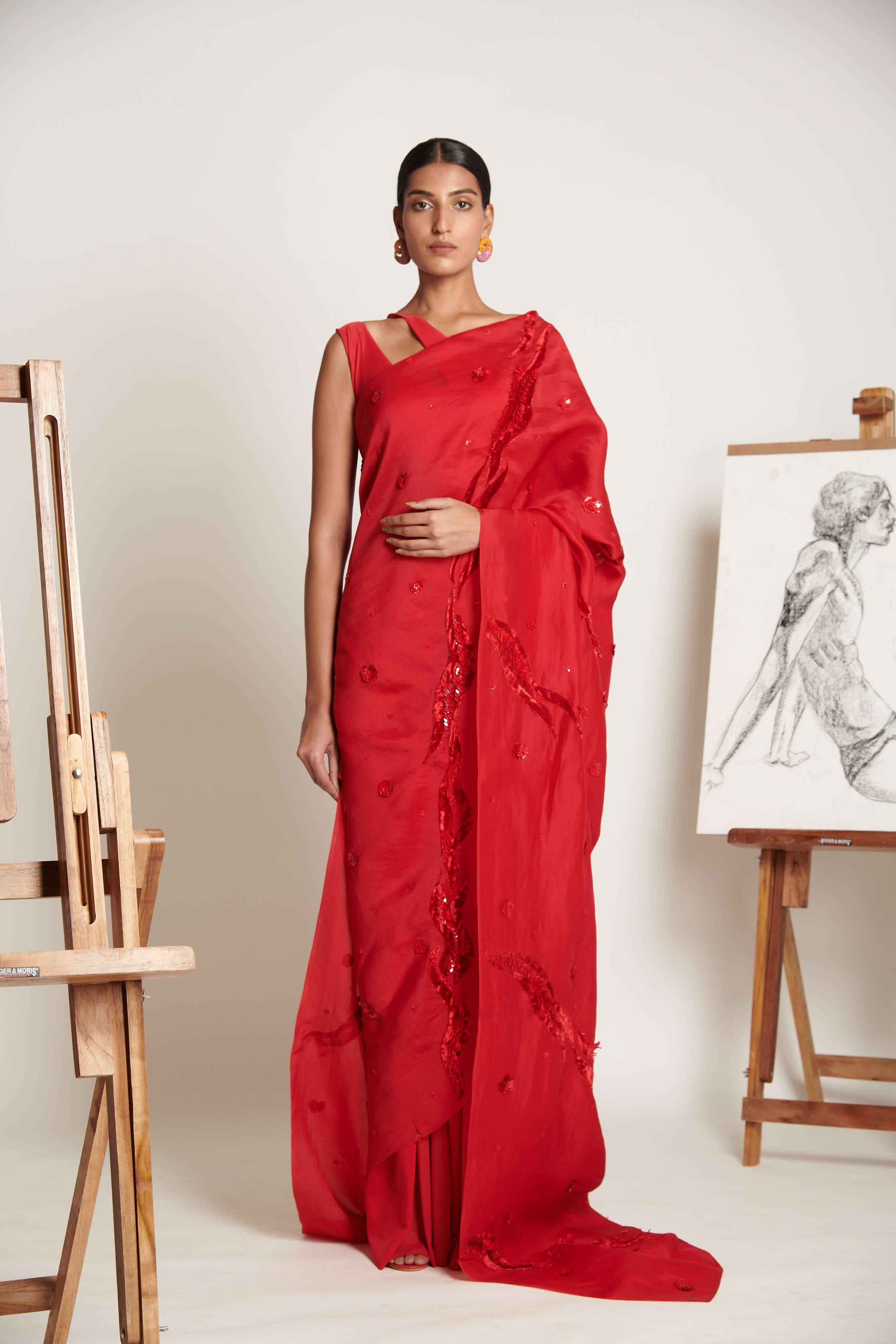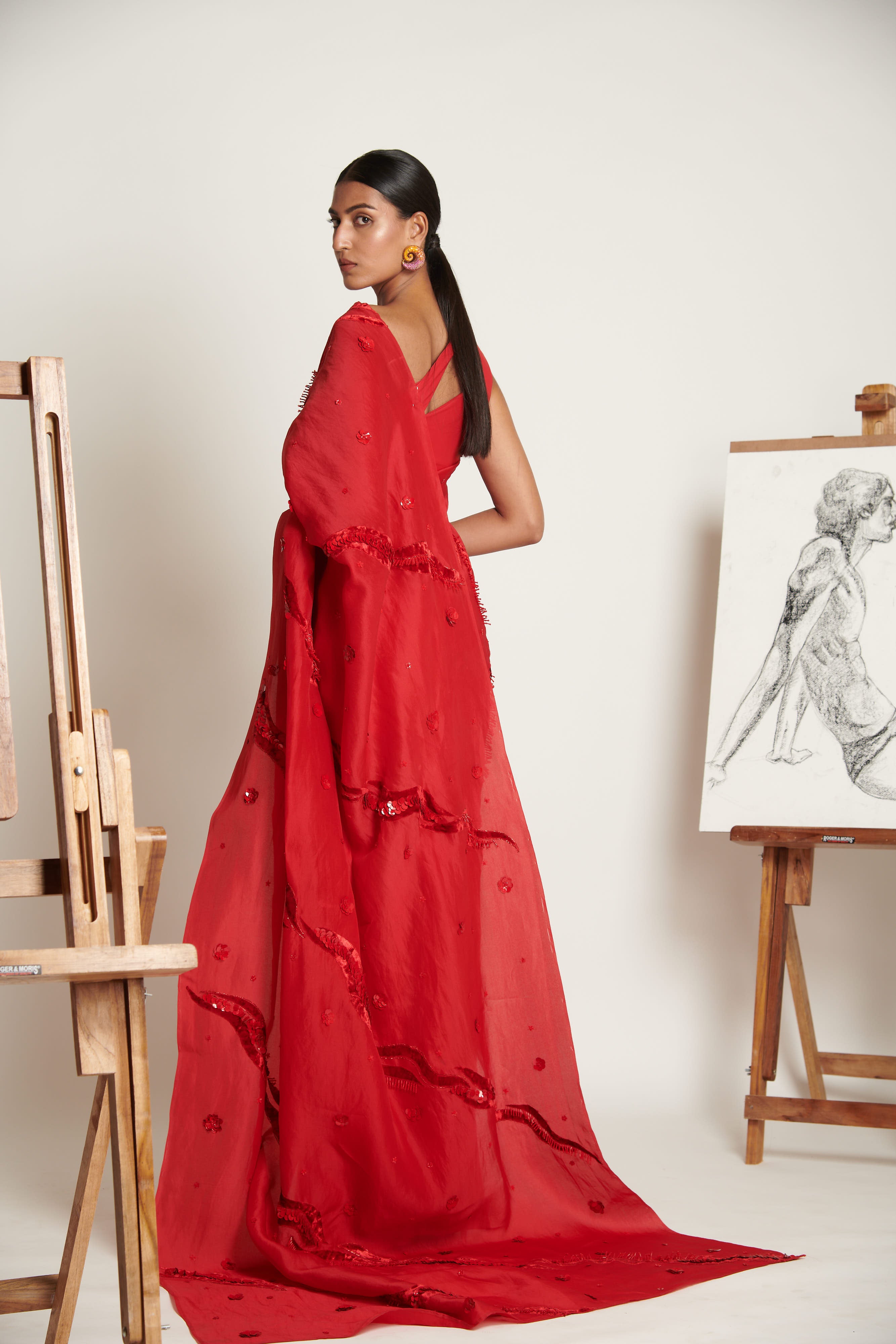 Sensual drapes dressed in celestial Skeinwork in handcrafted floral motifs across luscious folds of ruby red silk gazar for the Sari . Functionality is added to couture with a pre-tailored & pleated silk skirt, adding effortless ease to the joy of wearing this statement look.