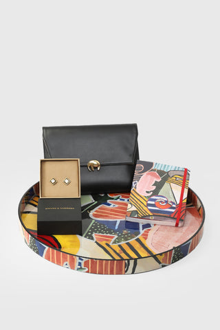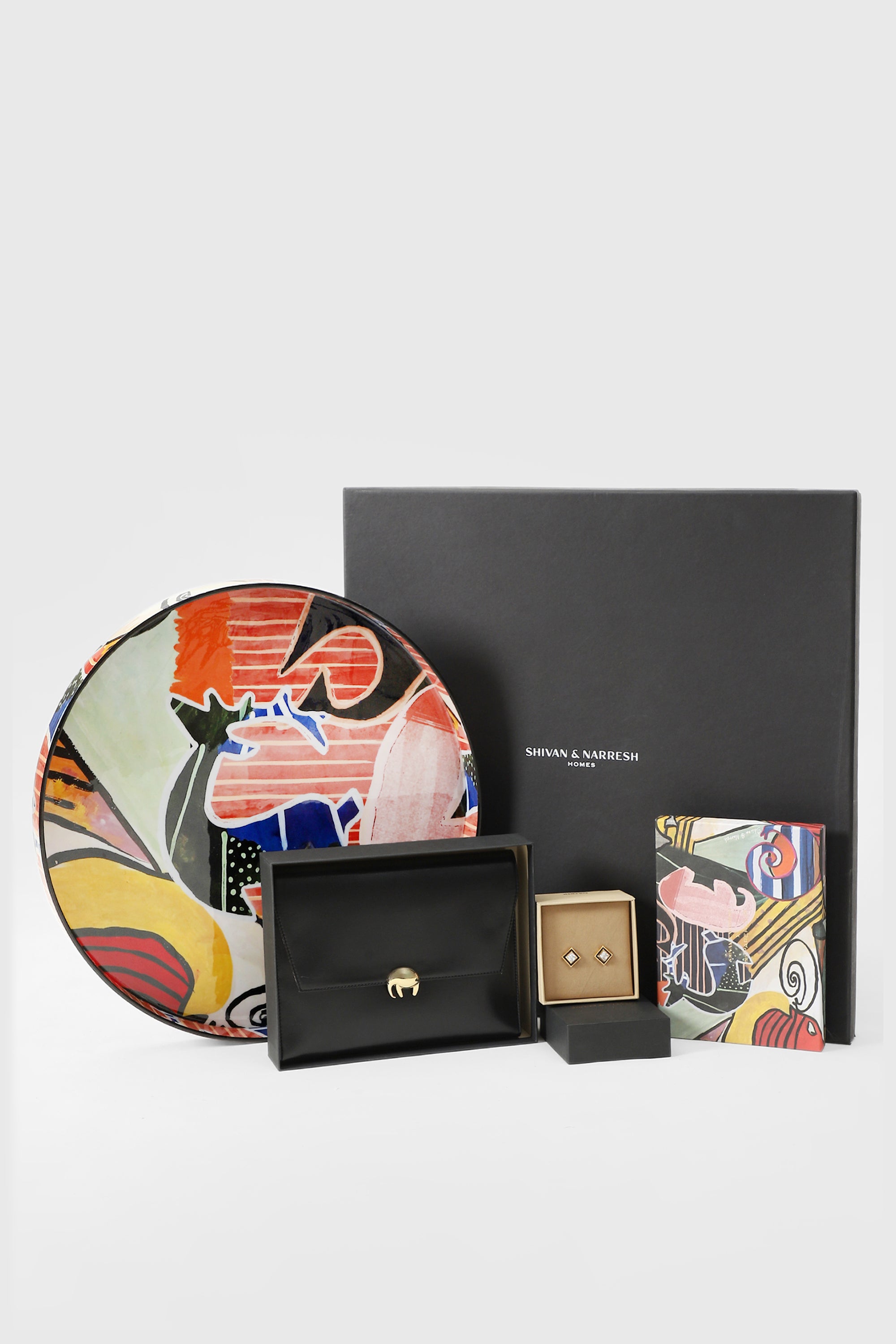 Embrace the art of gifting with impeccable range of home decor, stationery collectibles and elegant jewels adorned in SHIVAN & NARRESH signature prints. From Iconomash large Rondelle Tray and Iconomash Notebook to Numisma Jager Studs and Izu Juno Tablet Sleeve with Saf trim wrapped in luxurious individual packaging, it is perfect for every season.
