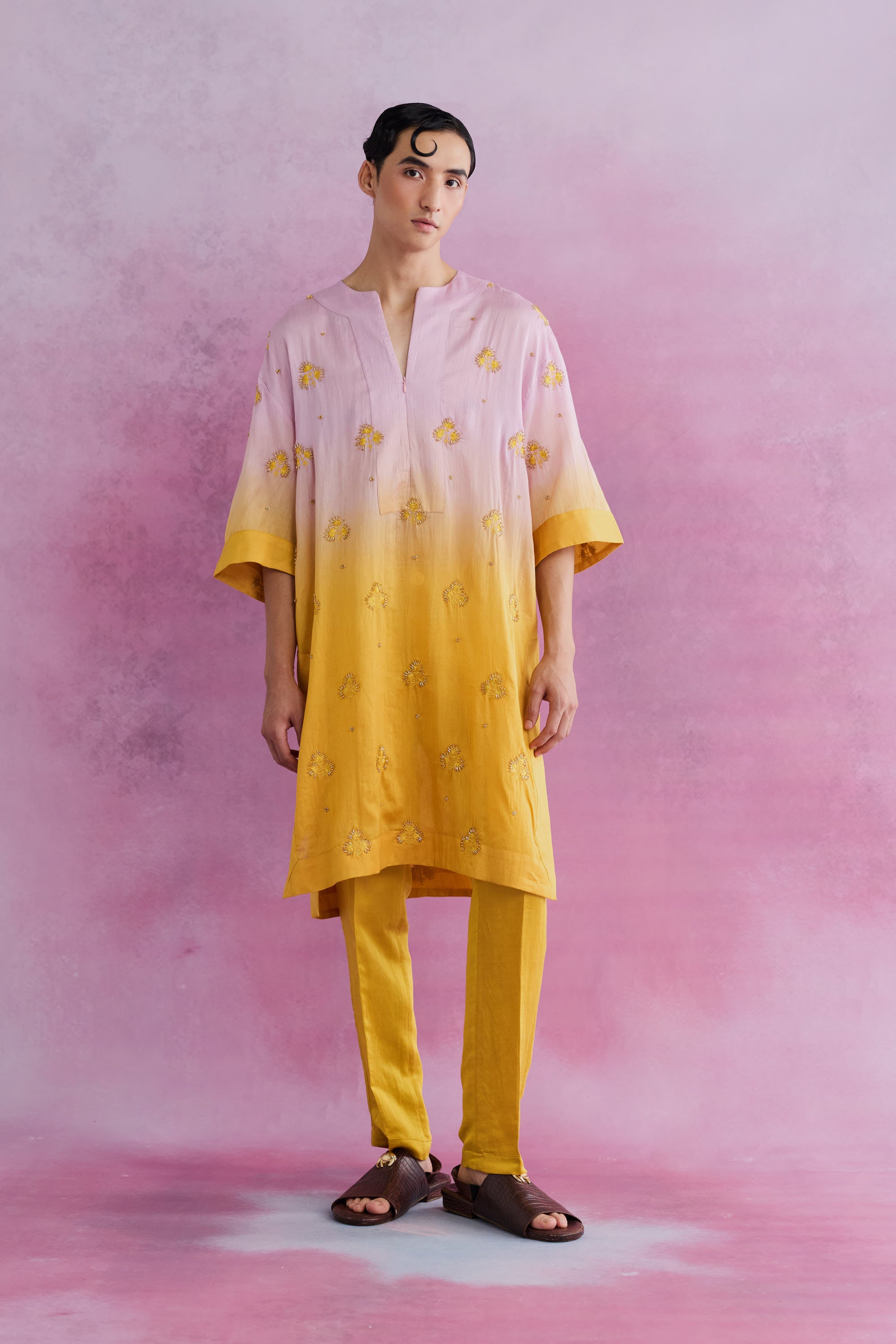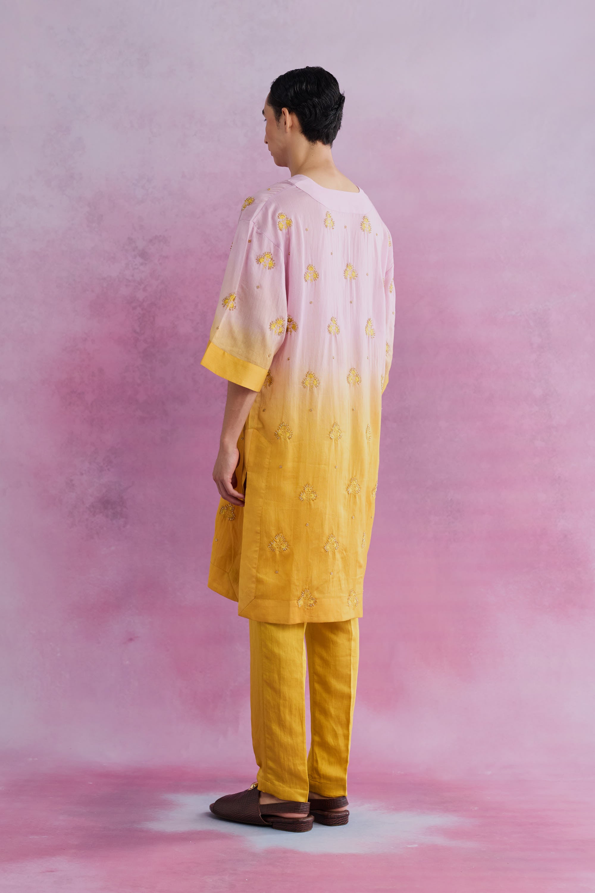 A bespoke riot of relaxed silhouette and meticulous design, the kurta features ombre tones of the florain art print accented with swirls of glass beads embroidery that imbibes a touch of playfulness and glamour. The complementary classic slim pants add a distinctive and refined statement