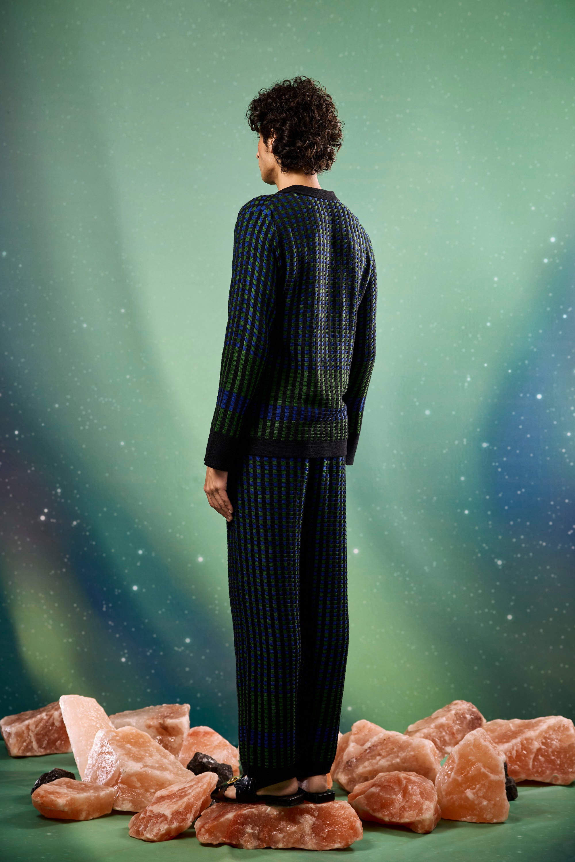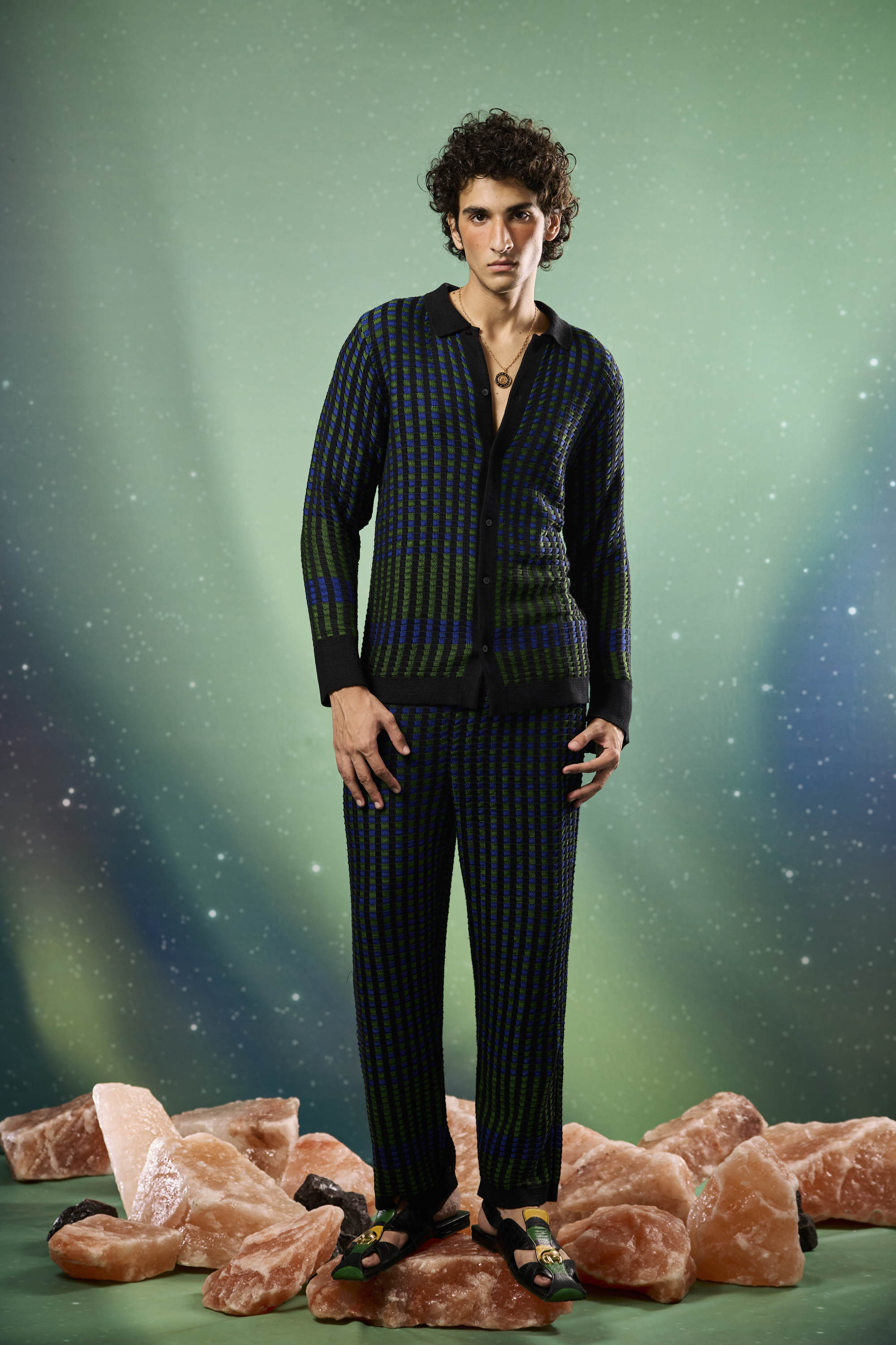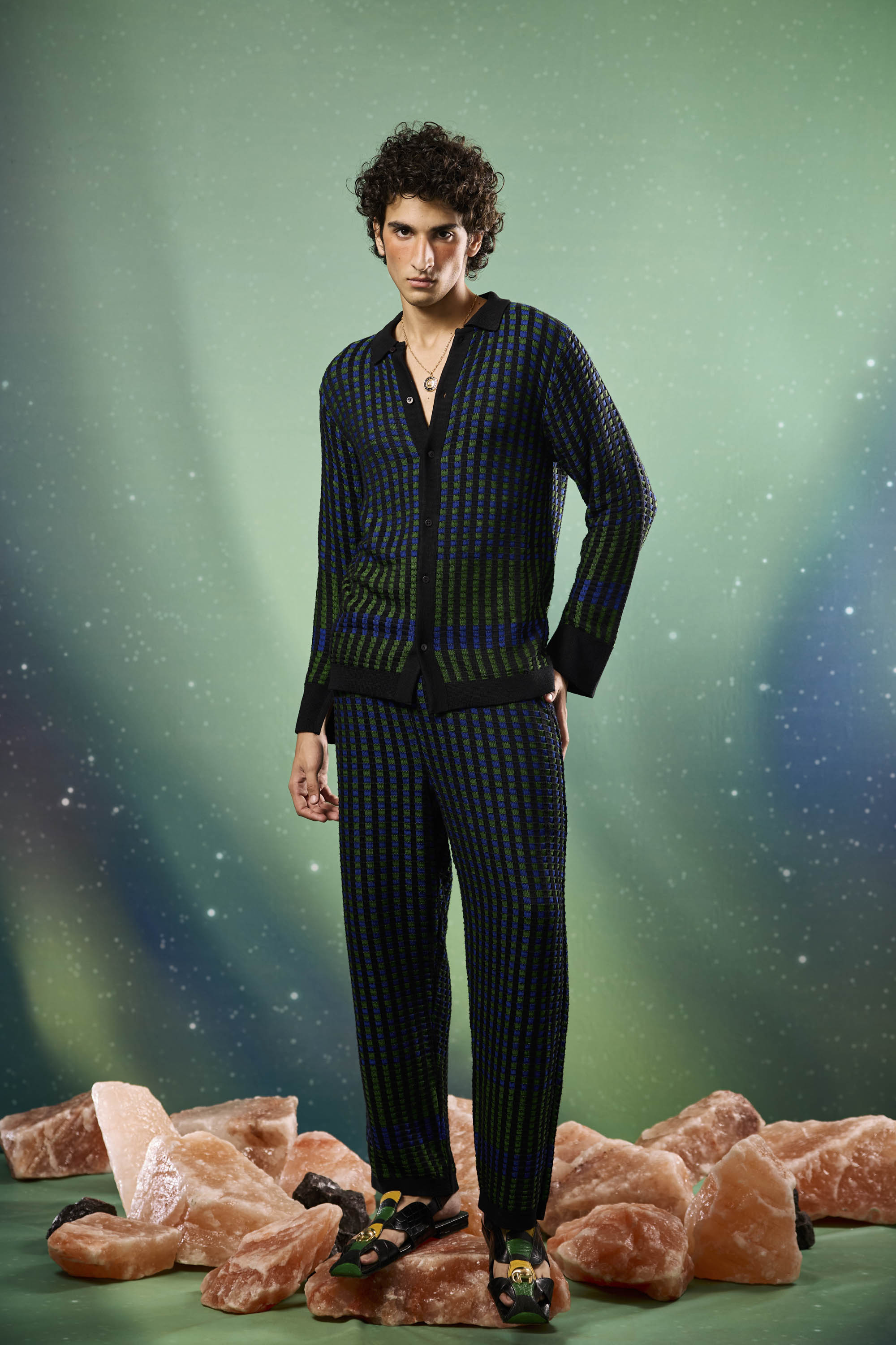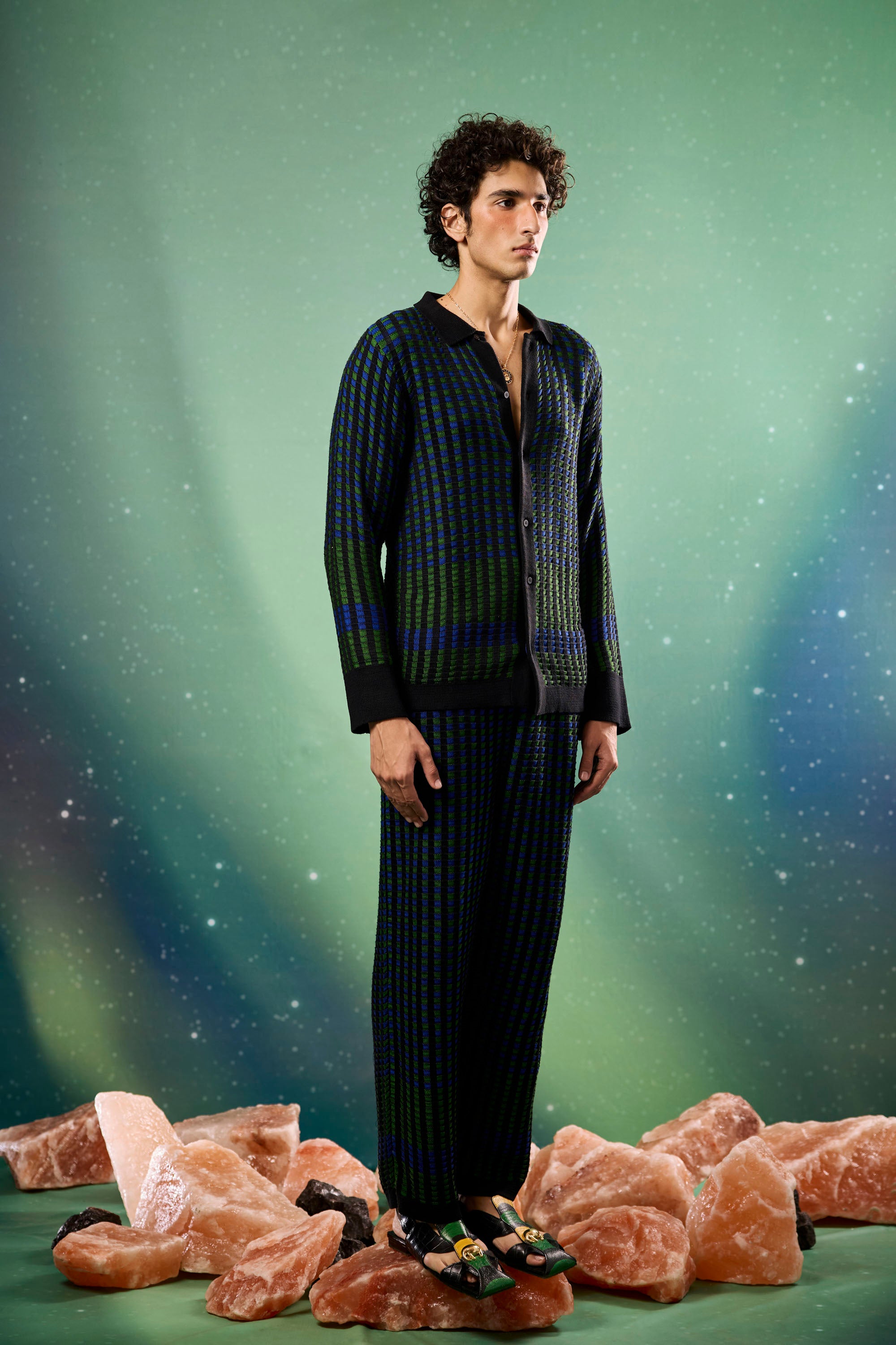 Hand-knitted techniques adds a dapper look in Midnight Mosaic Knitted Shirt which highlights a relaxed open collar. Crafted from cotton, It's the perfect choice for those looking to make a statement while enjoying a touch of seasonal flair. Pair it with similar hues trousers to complete the look.