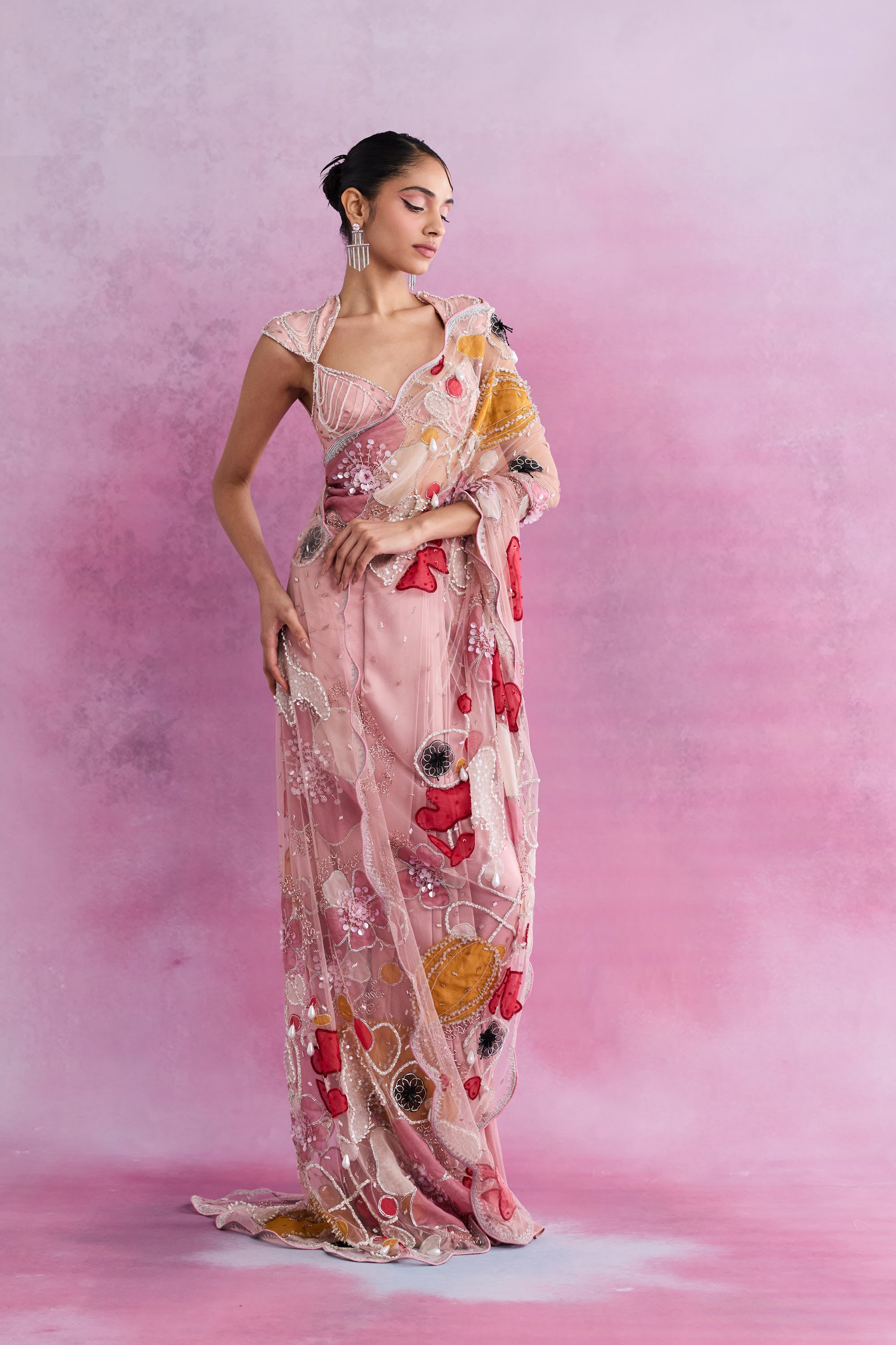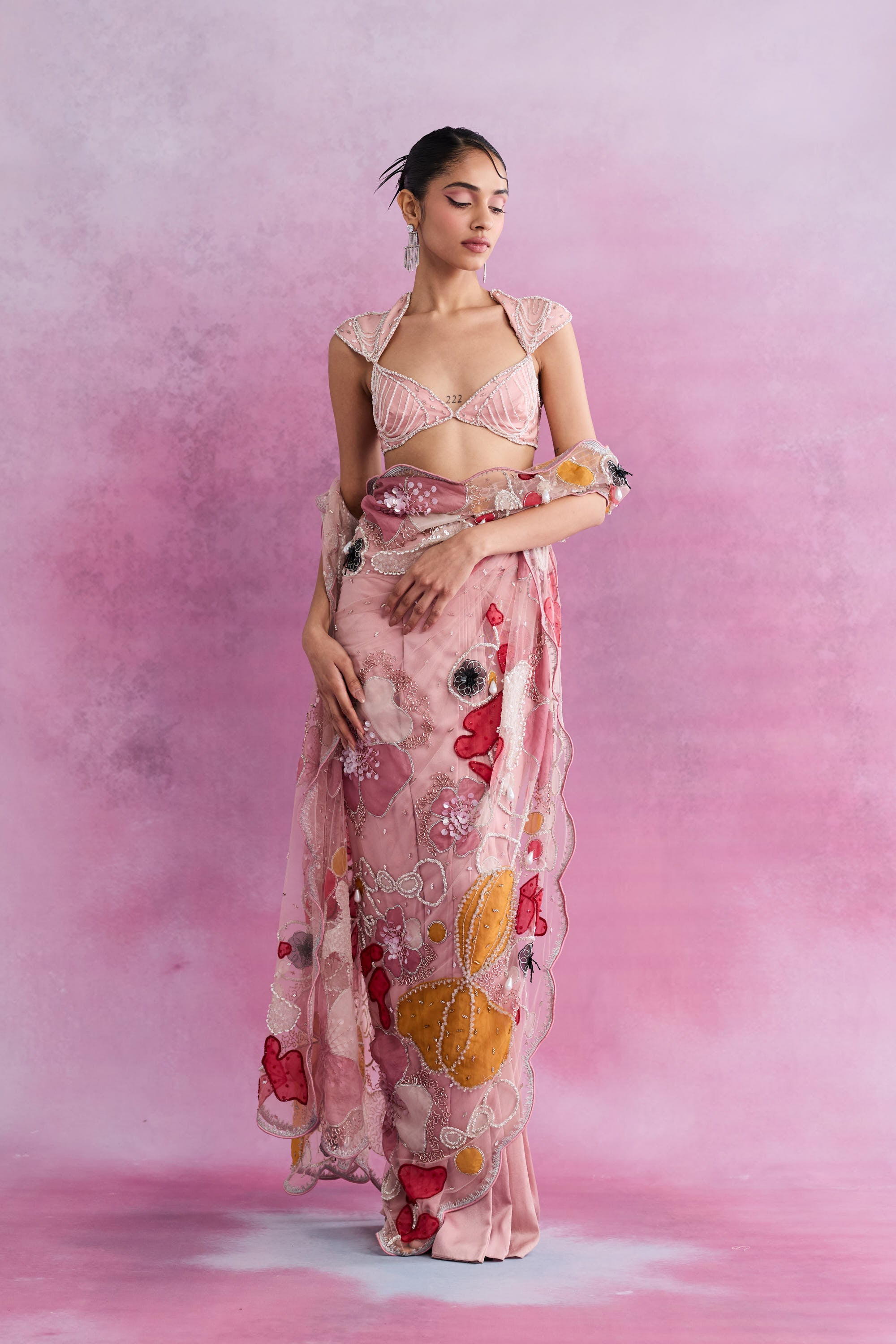 Blush Fleur Applique Tailored Sari with Embellished Blouse