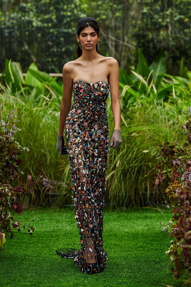 Crystal Confetti Stellar Gown is shaped to a signature body-contouring silhouette stitched with boned bodice and floor-sweeping hem. It's signed off with a glittering glaze of crystals and three dimensional skeinwork all-over that catch the light with each stride.