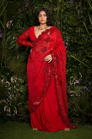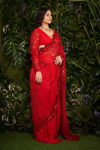 Florescence Appliqué Corset Dress is a bespoke riot of whimsical aesthetic with meticulously handcrafted florets illustrating the visual delicacy of botanical influence. Whipped up in delicate tulle and italian jersey, it is defined by a form fitting silhouette and asymmetric hem.