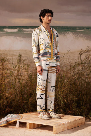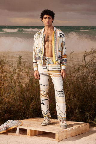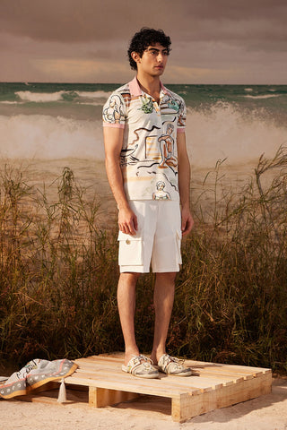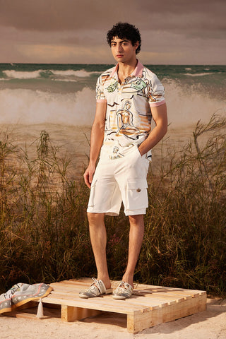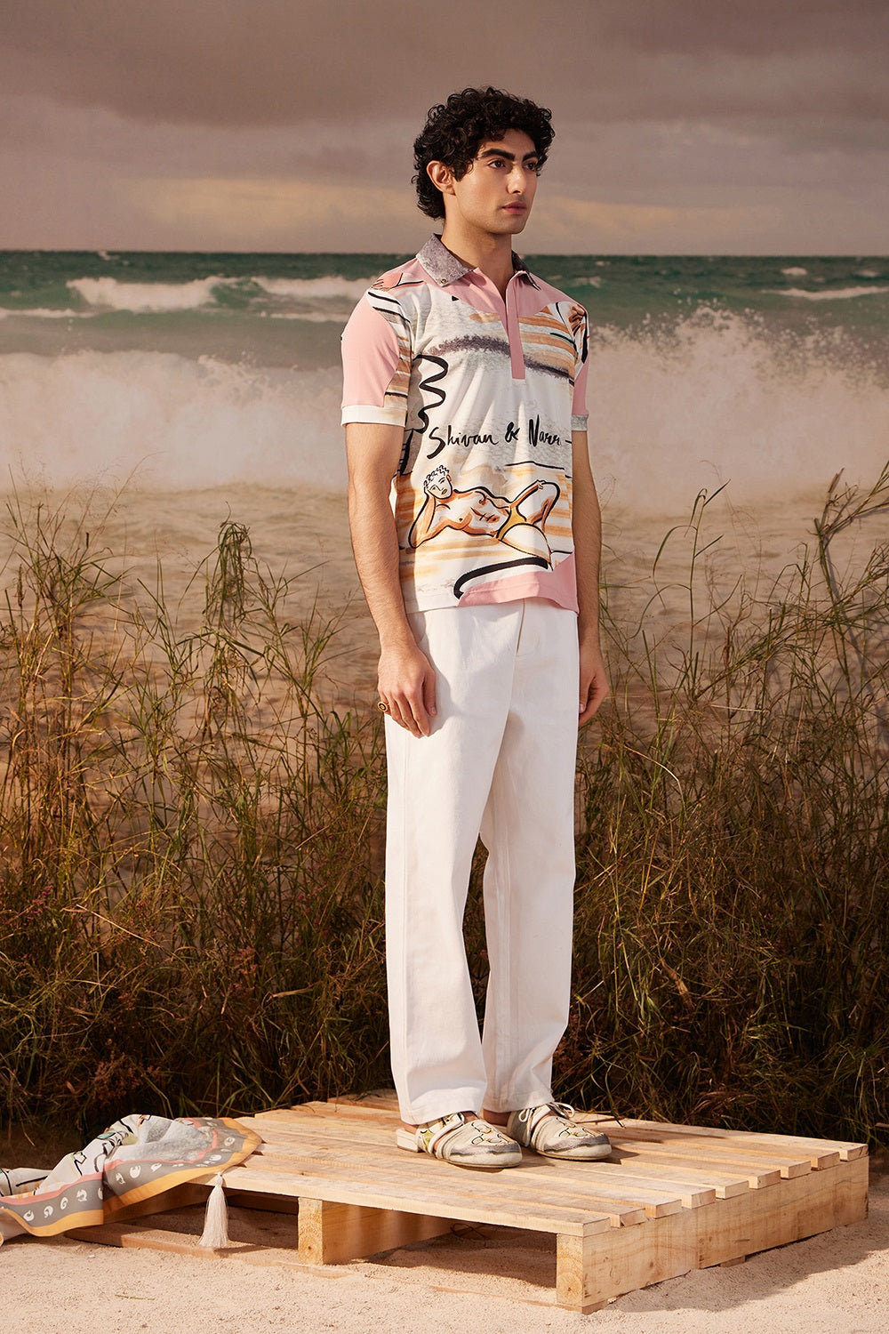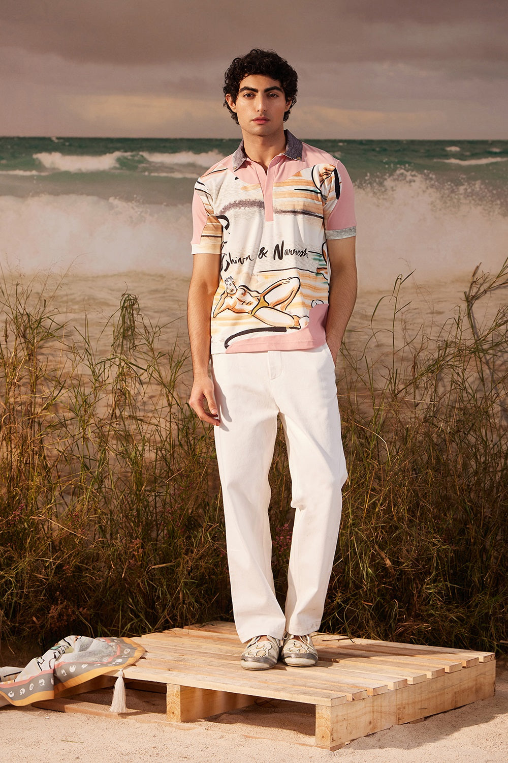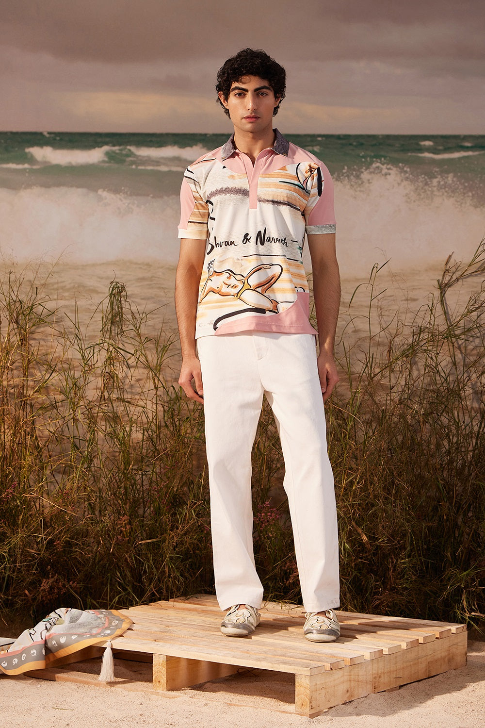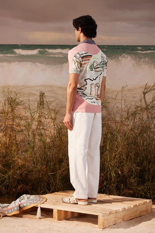 Offering an off-beat twist on classic, Saun Wavy Polo with Iconopins creates an elegant look with masculine detailing. Cut from diamond weave jersey, it showcases the brand's signature print along with iconopins on collar keeping the look sharp and suave.