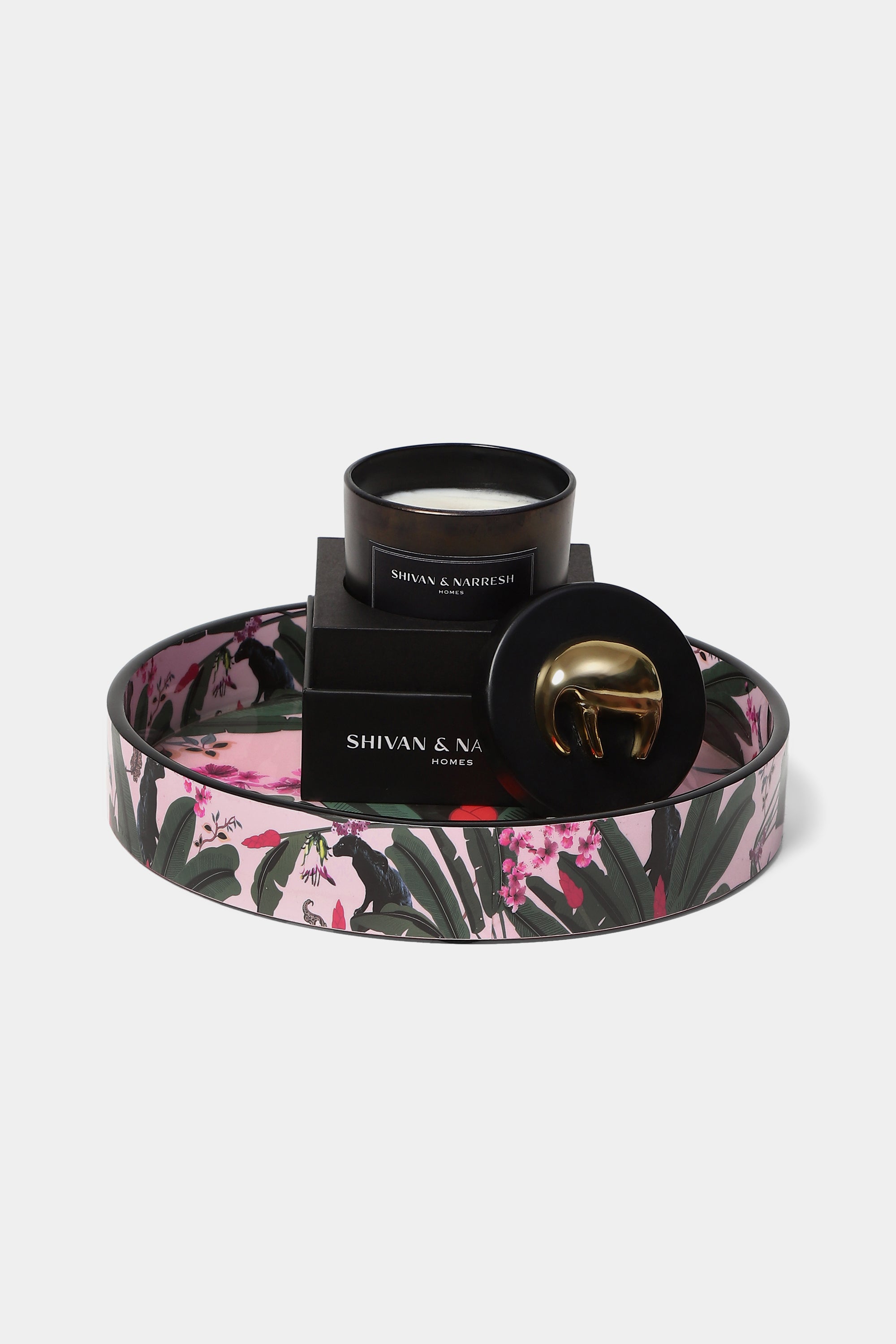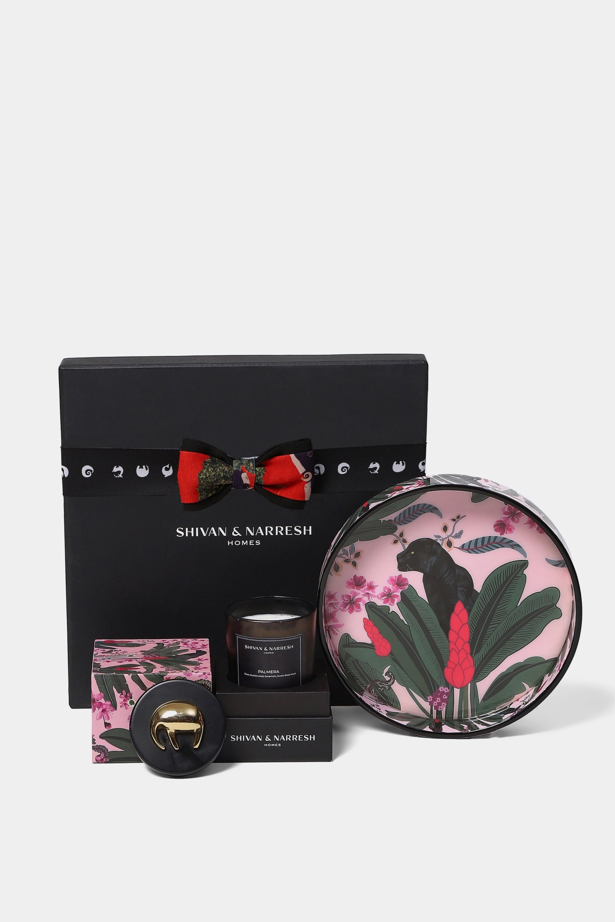 Discover a handpicked curation of elegant home decor inspired by the palmera print from the Araki series. With a combination of small Rondelle tray and Votive candle wrapped in sophisticated individual gift boxes, it is a perfect gifting set for every season.