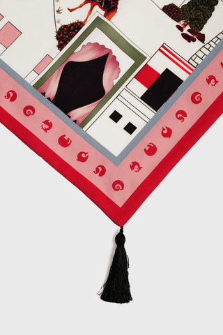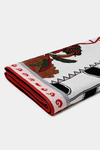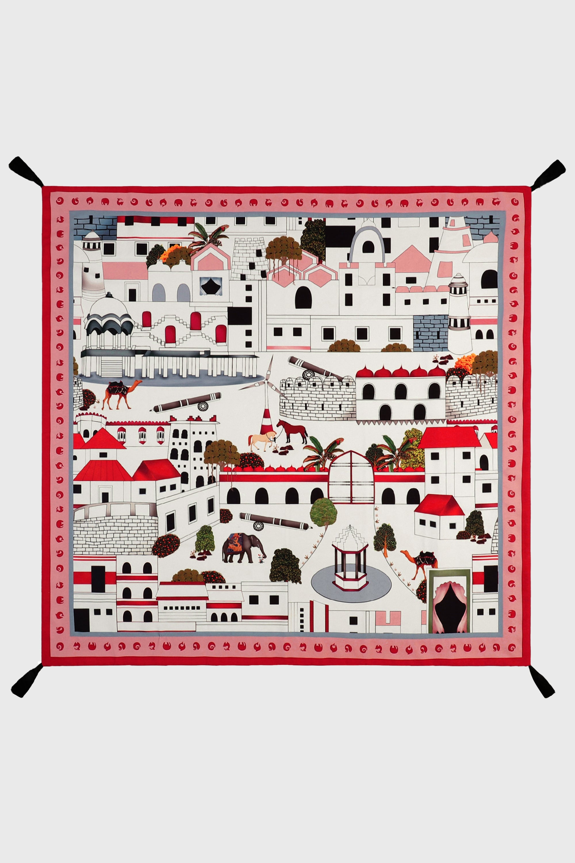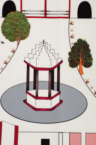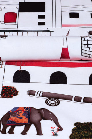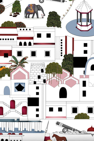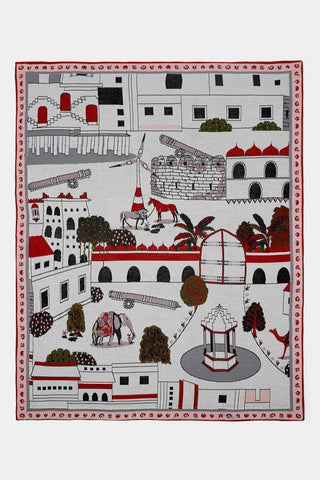The serene Art print from the Iconoscape Series, Jaiscape celebrates the urban landscape of Jaisalmer rendered in the Pichhwai-style of painting interspersed with brand elements. Printed on canvas, the pristine ivory colorway will complement any interior hue.