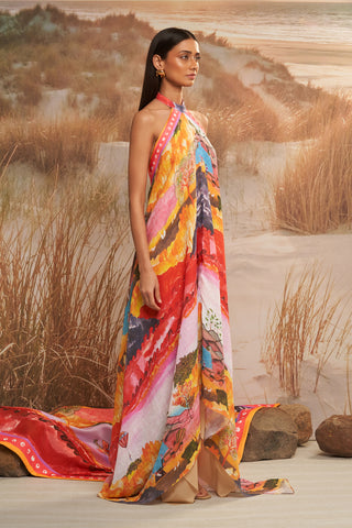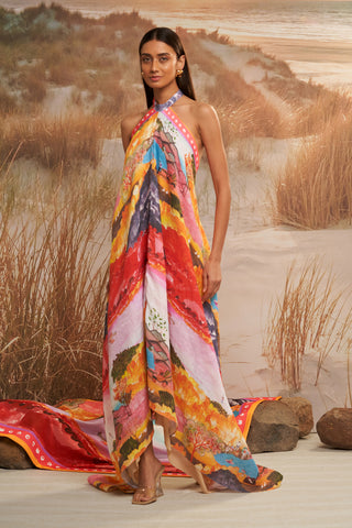 A kaftan inspired silhouette, this satin Ombre Asymmetrical Halter Dress with an exaggerated collar drops down into an asymmetrical hem with an iconoband placket. The sexy back tie-up and chic ombre colour ensure you’ll be ready to flow as well as party in this piece!