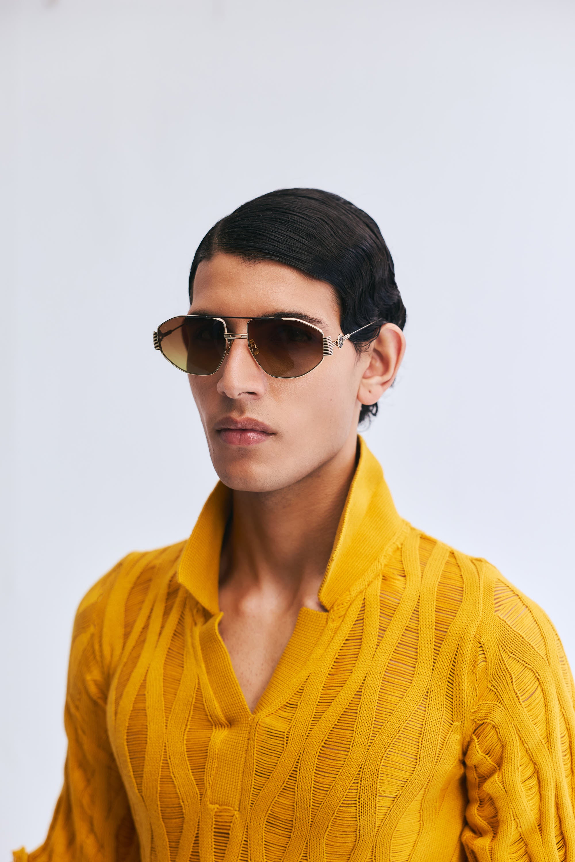 Crafted from premium metal, the Cecil Gold Sunglasses showcase a distinctive aviator shape that exudes modern sophistication. These limited edition sunglasses feature a sleek chrome frame complemented by statement side temples with Shivan & Narresh’s signature Iconocoins. Perfect for elevating any look, Cecil makes a bold statement while suiting a diverse range of face shapes.