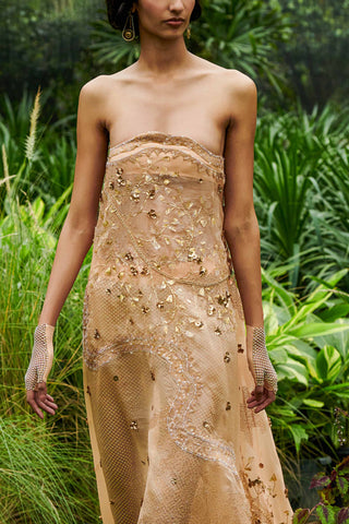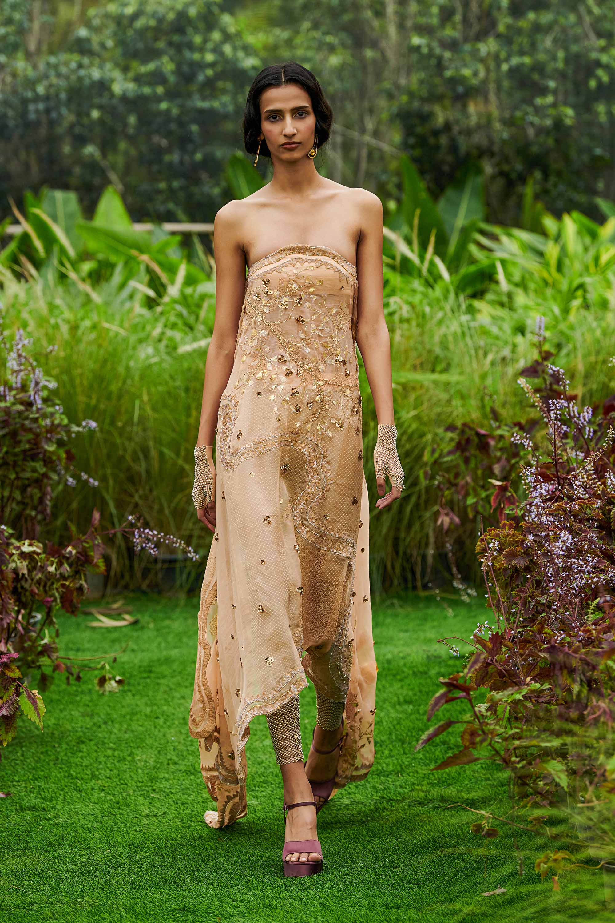 A modern take on celebratory silhouettes, the top features a gliding layer of silk organza decorated with tonal embroidery & handcrafted resin elements, paired with cigarette pants in crystal mesh for a striking statement