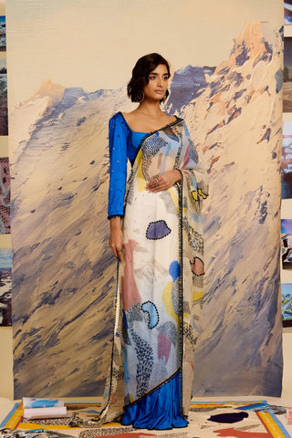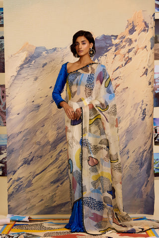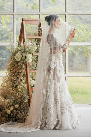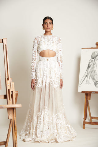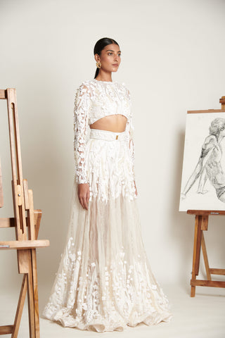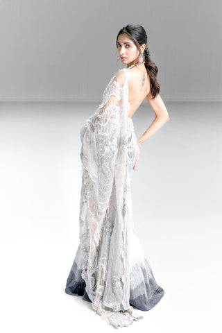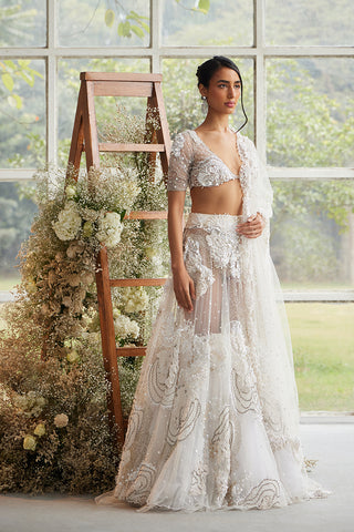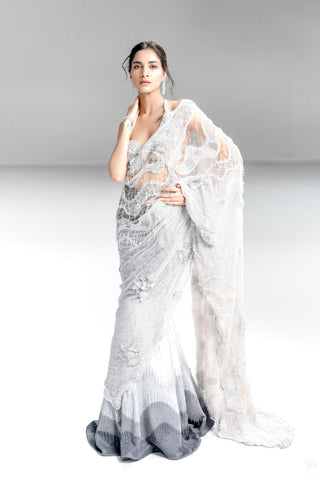Indulge in the timeless allure of the Ecru Pearlescent Scallop Sari on delicate tulle that defines timeless musing of couture craftsmanship. The sari is graced with trains of glass beads and pearl skeinwork and the look is finished with an elegant beaded blouse.