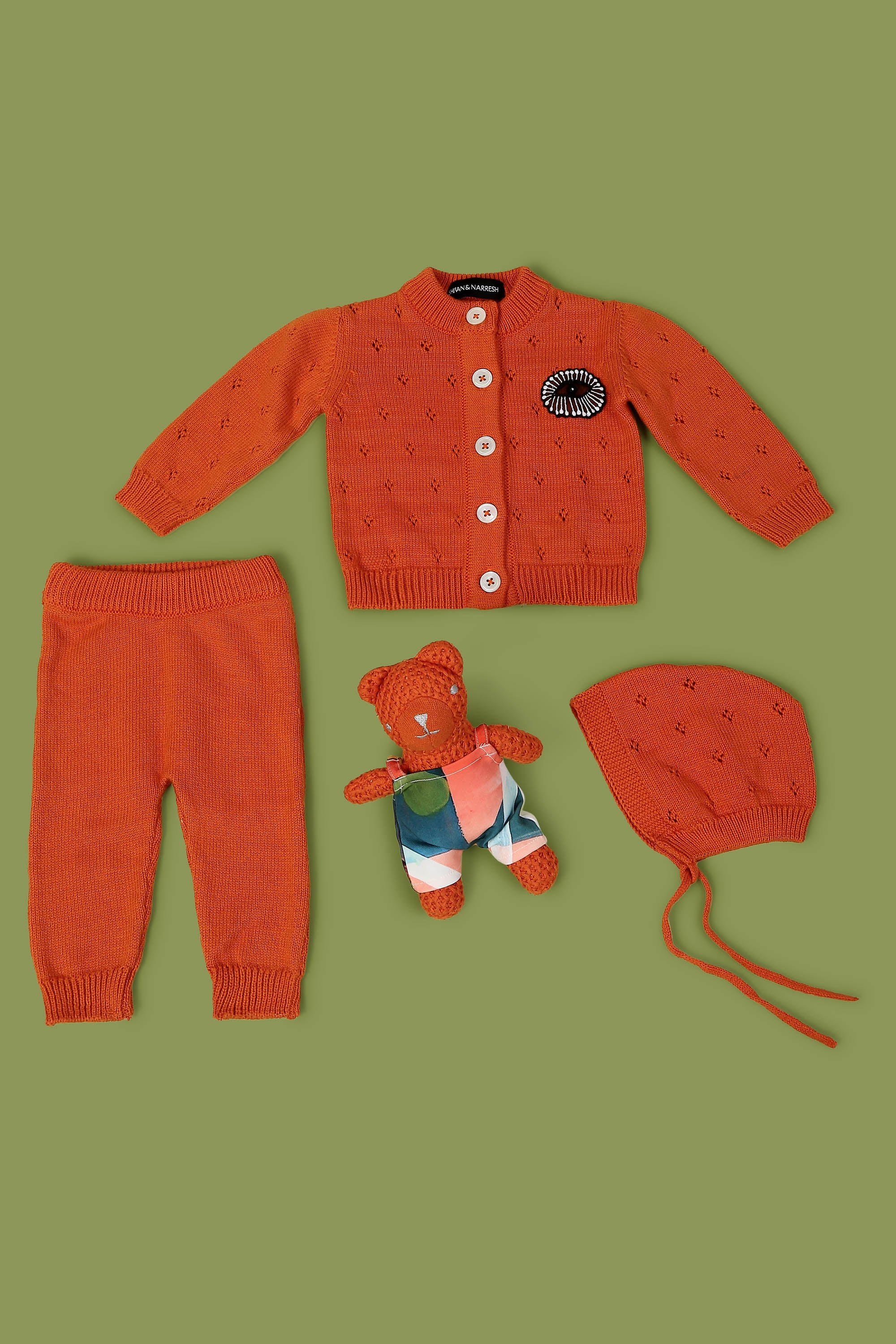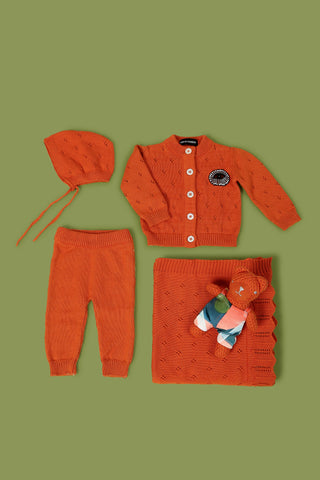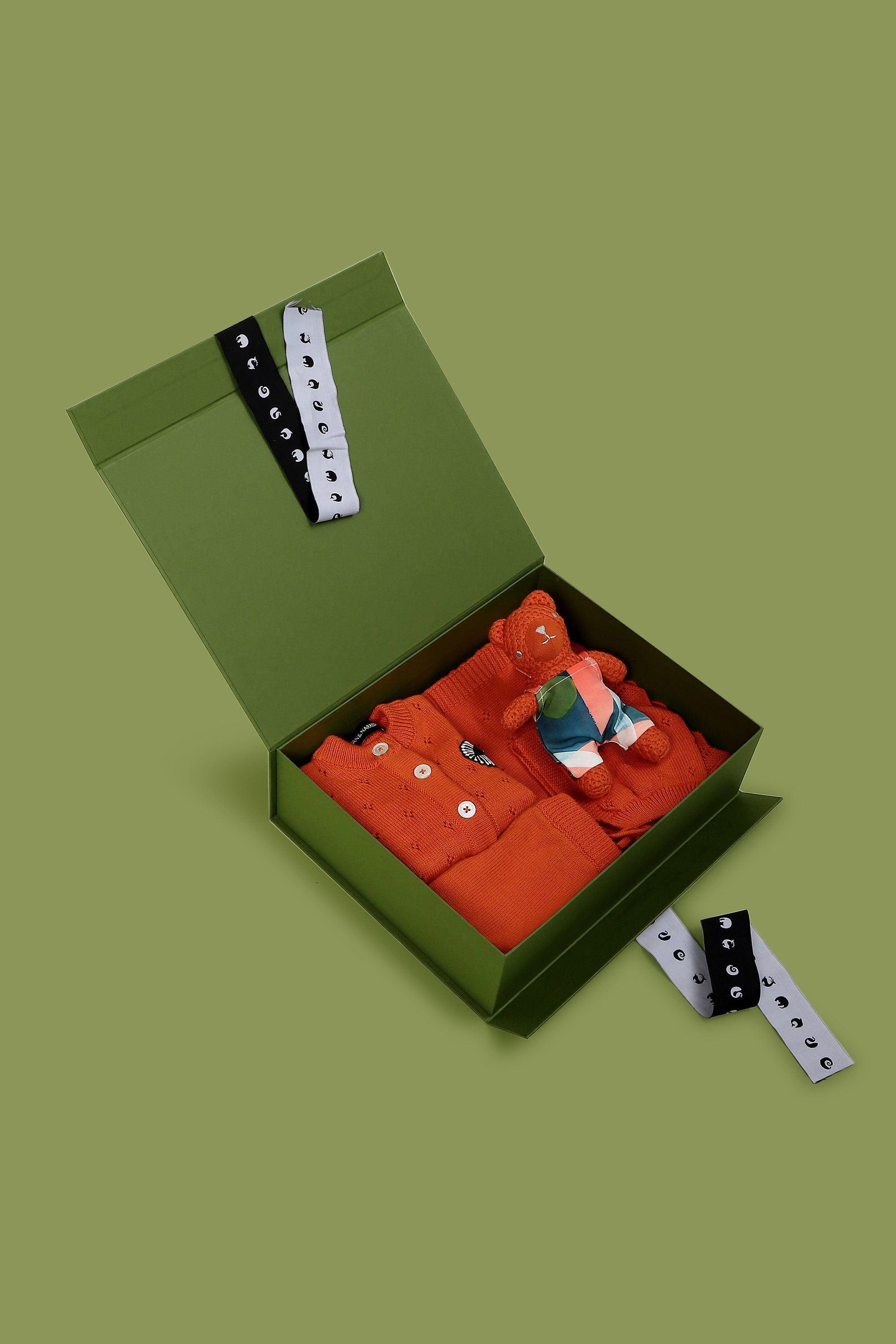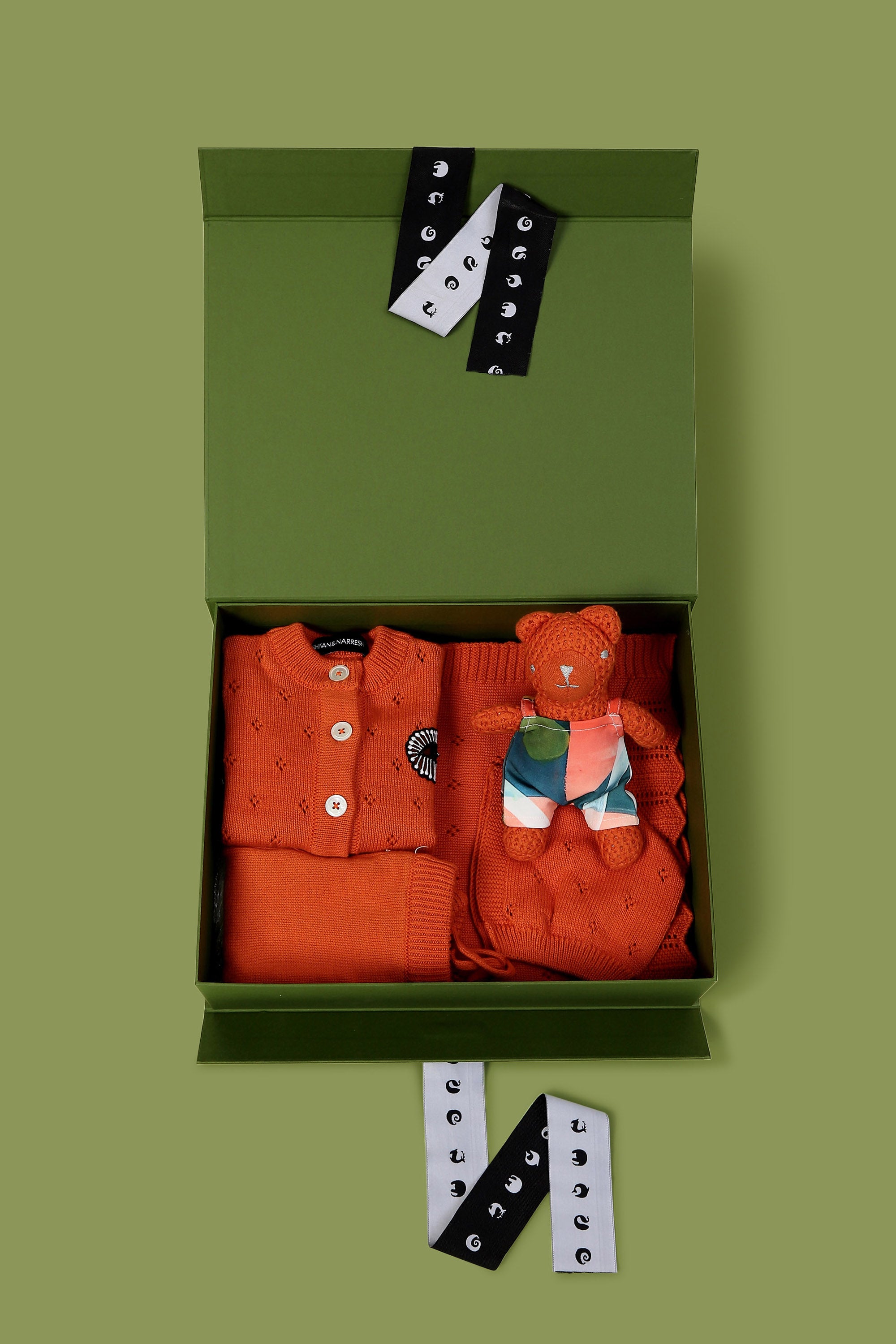 Thoughtfully curated and wrapped with love, Ivory Plushie Baby Gift Set features a set of five adorable items, including cardigan, pants, bonnet, blanket and bear plush toy. Crafted from premium quality combed cotton, the set features baby essentials presented beautifully as a gift for a new arrival.