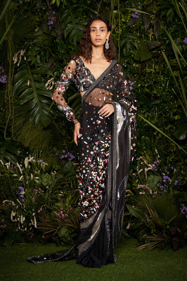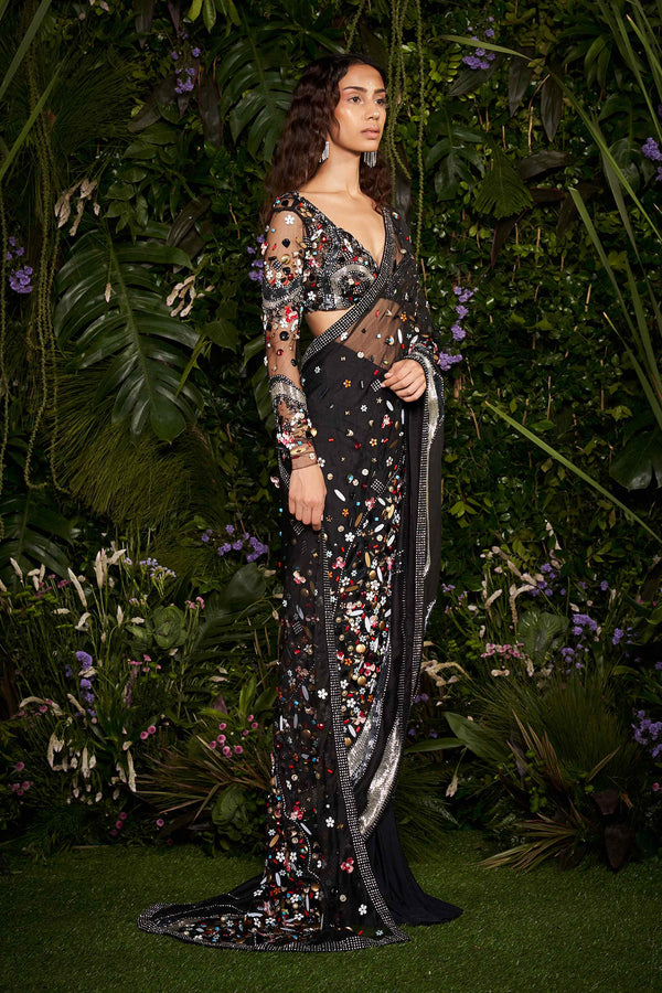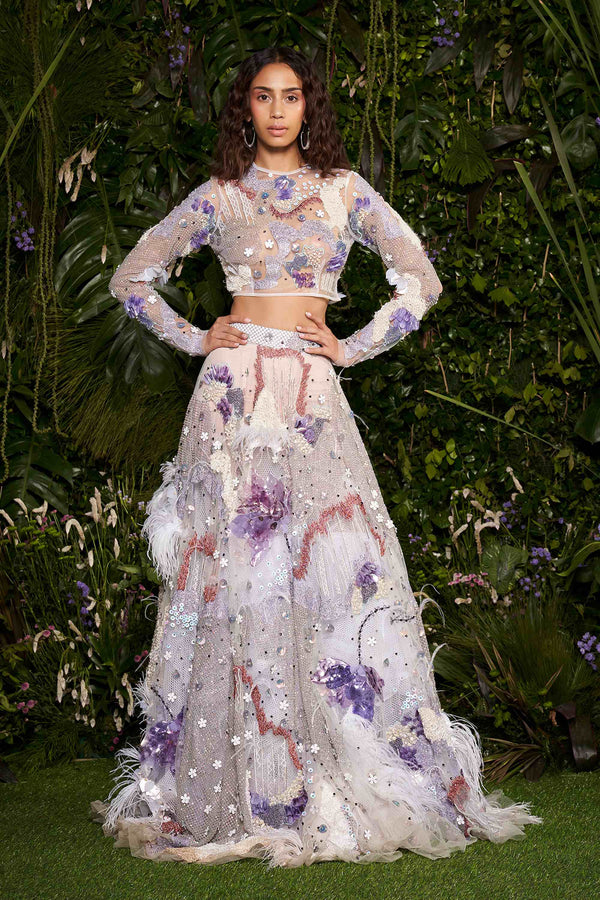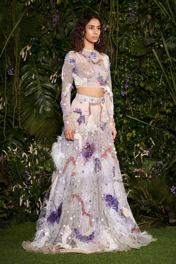 Marking a moment with a striking Champagne tone, the Couture sari features a symphony of preadolescent sequins, handcrafted threadwork & delicately embroidered scalloped border. The off-shoulder blouse is festooned with tassels of glass beads and skeinwork adding a dimension of elegance.