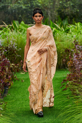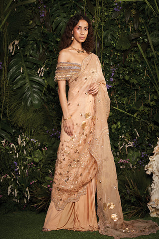 Champagne Foliage Scallop Tailored Sari with Cascading Bead Blouse
