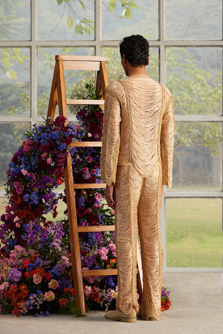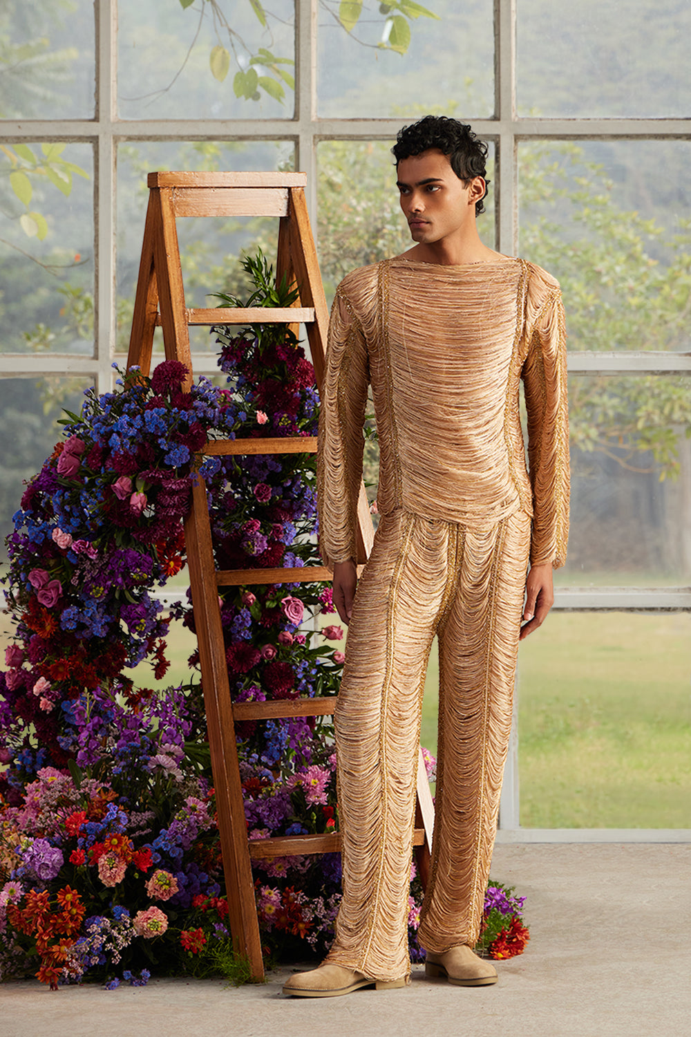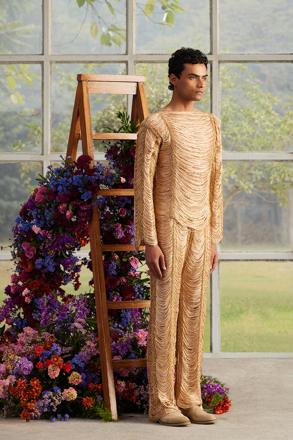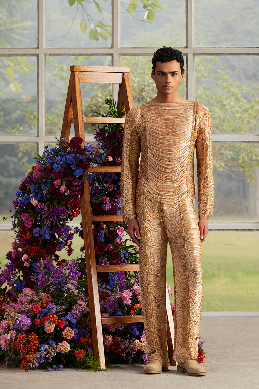A luminescent play of form and texture frame a meticulously crafted co-ord set for men. Knitted from silk threads and strung with tonal glass beads, the look redefines a timeless language for the modern man.