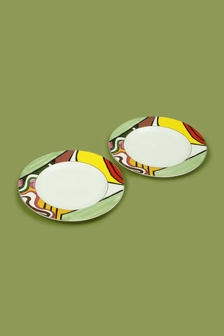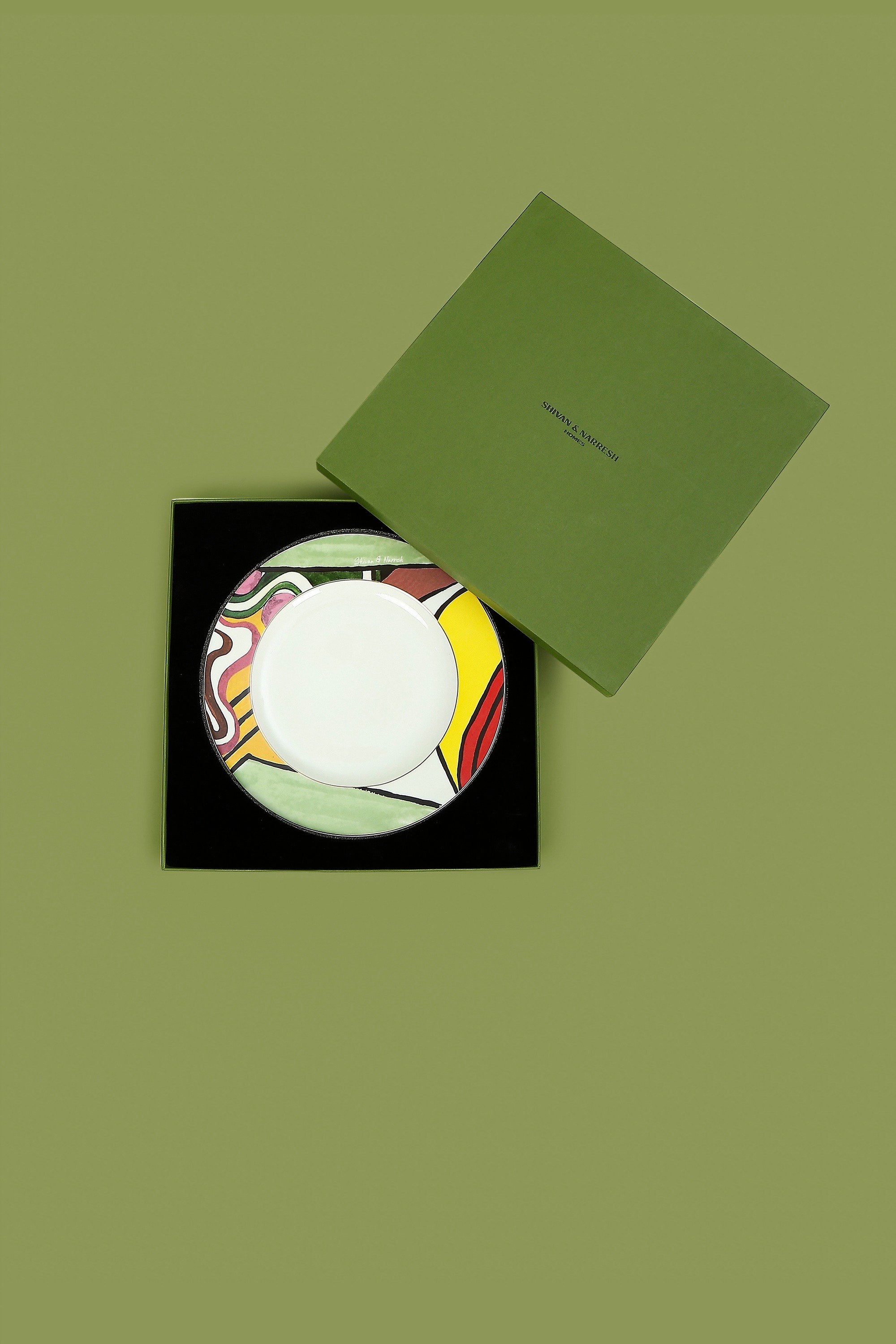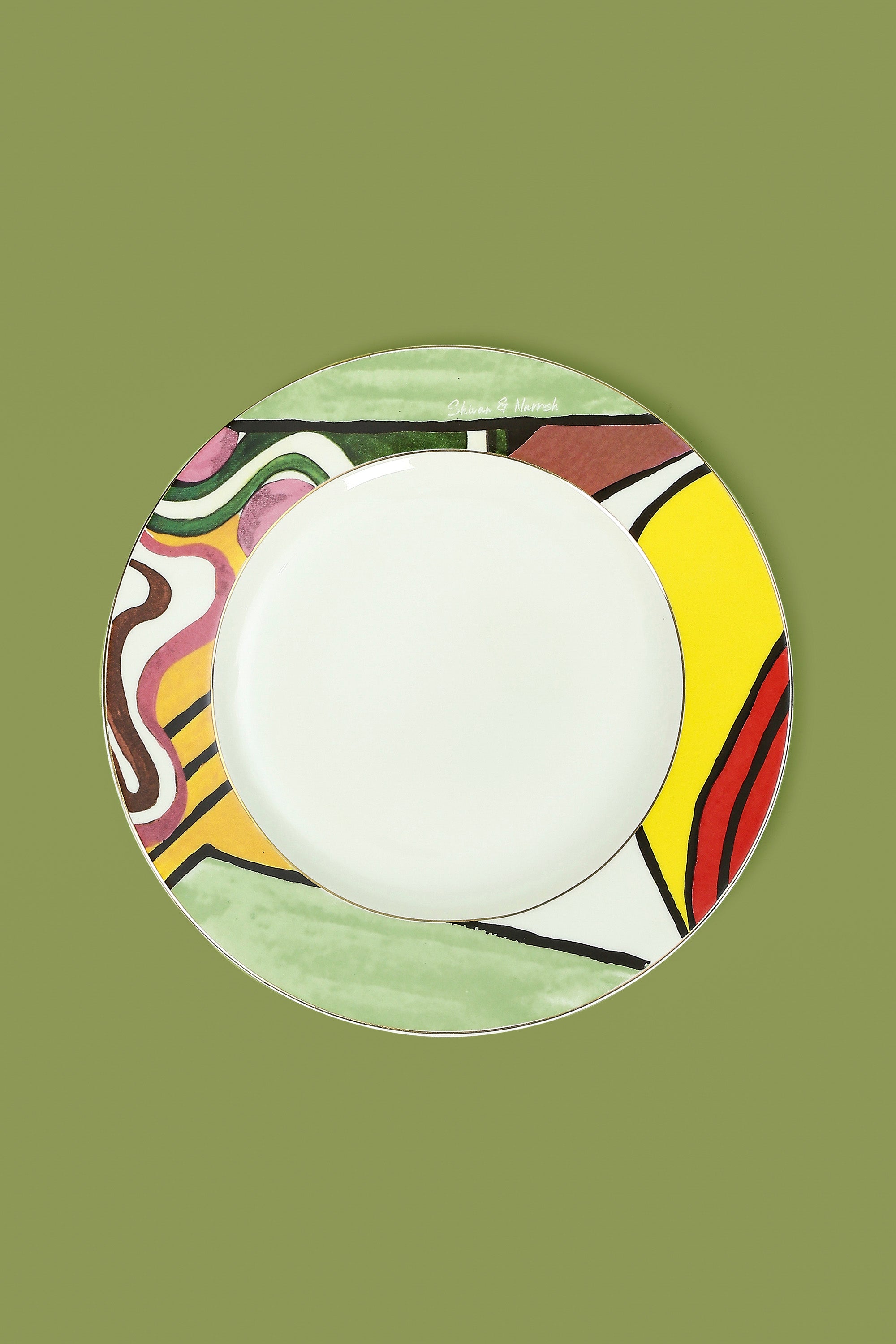 Crafted from fine porcelain, this vibrant dinner plate brings an artistic flair to your dining experience. The bold, abstract design adds a dynamic statement to any table setting. Whether you're hosting an elegant dinner or enjoying a casual meal, this plate blends functionality with visual impact. To complete the set it can be paired with the small plates and bowls from the collection.
