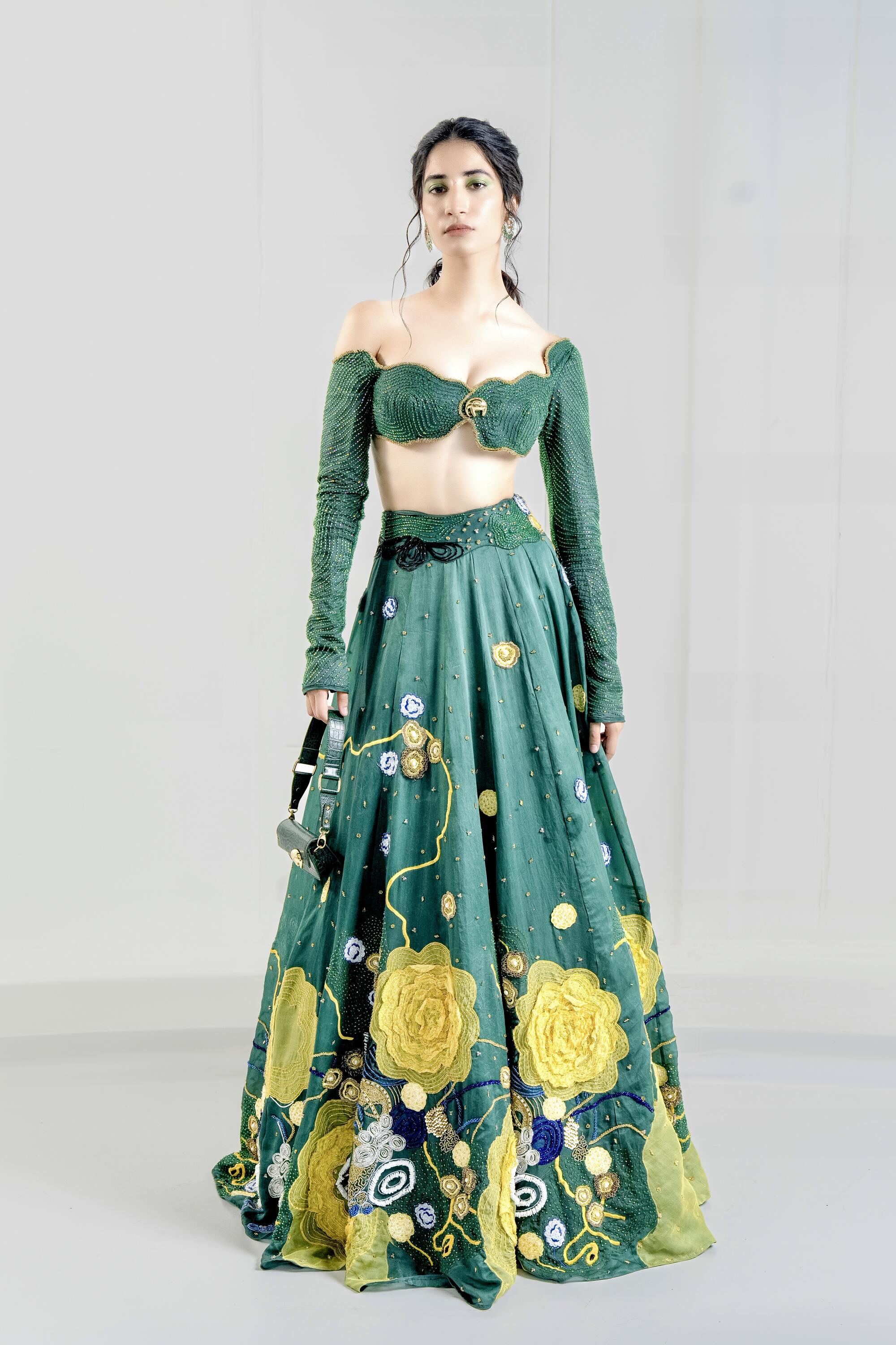 Inspired from lushness & abundance of greens, the lehenga features cascading over layers of organza balanced with sheen & sparkle of glass beads strewn across the textured surface. It comes along with a one shoulder hand-knitted embellished blouse to create a scintillating statement that redefine modern couture.