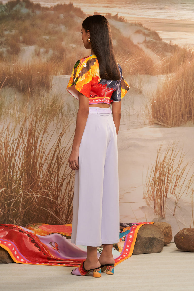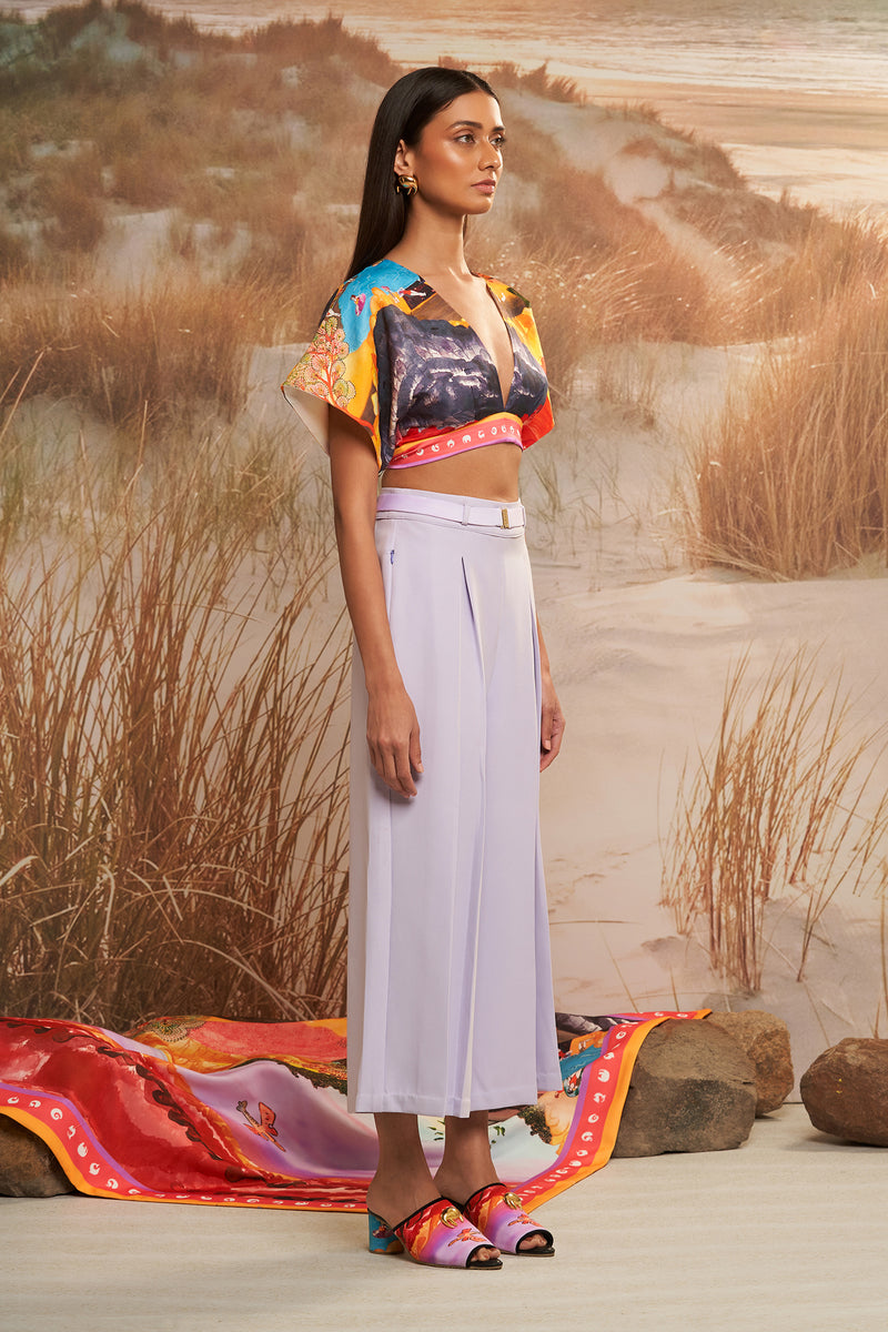 Sharp pleating meets resort wardrobes in the Lavender Flared Trousers. With a wide-legged cut, the trousers are ideal for pairings with cropped tops to bring out the cinched waist line & the trousers' luxe features.