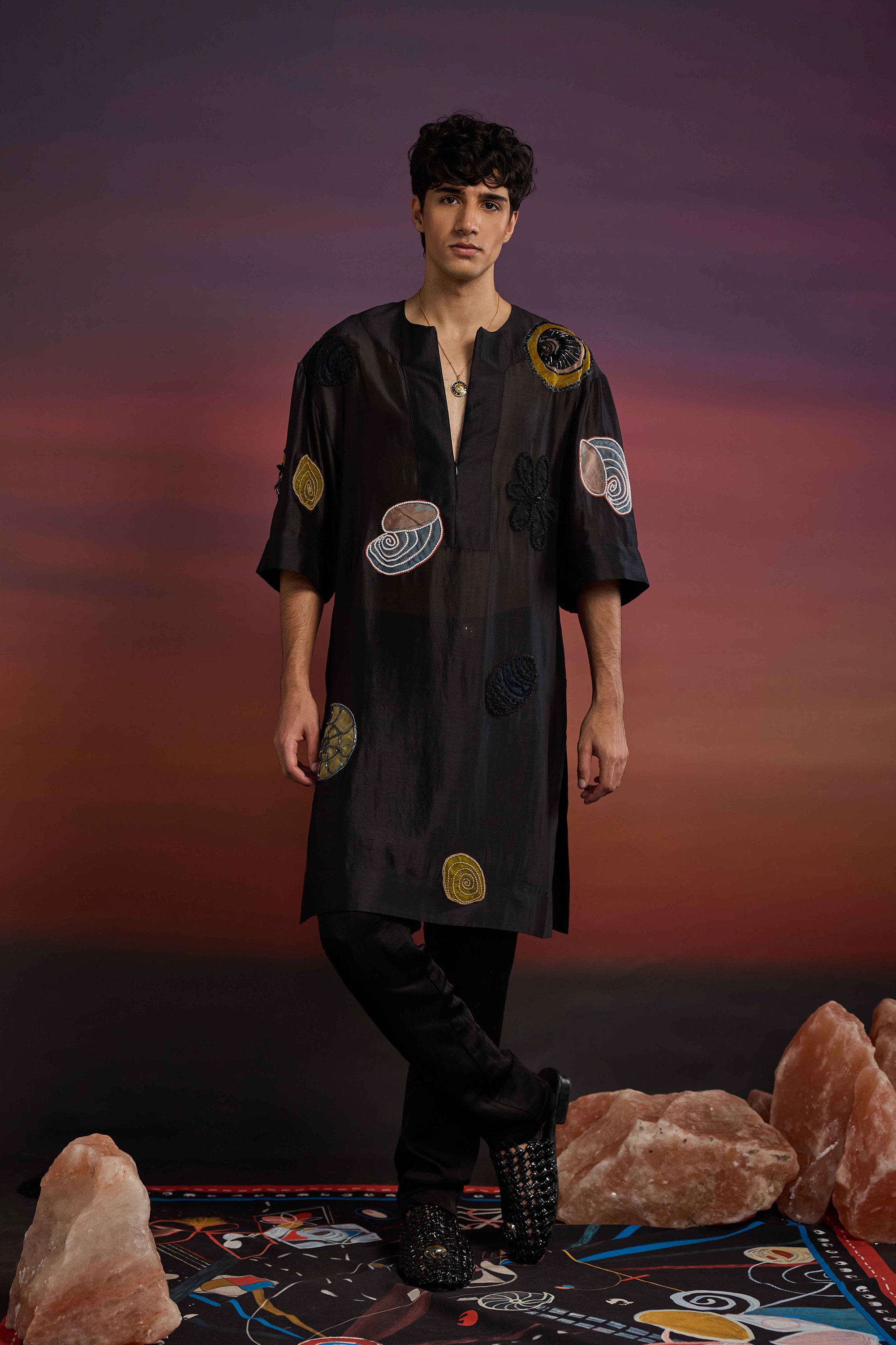 Crafted with inspiration from the celestial cosmos, the Mysterique Afghan Kurta set in deep hue of ebony is elevated with applique skeinwork.