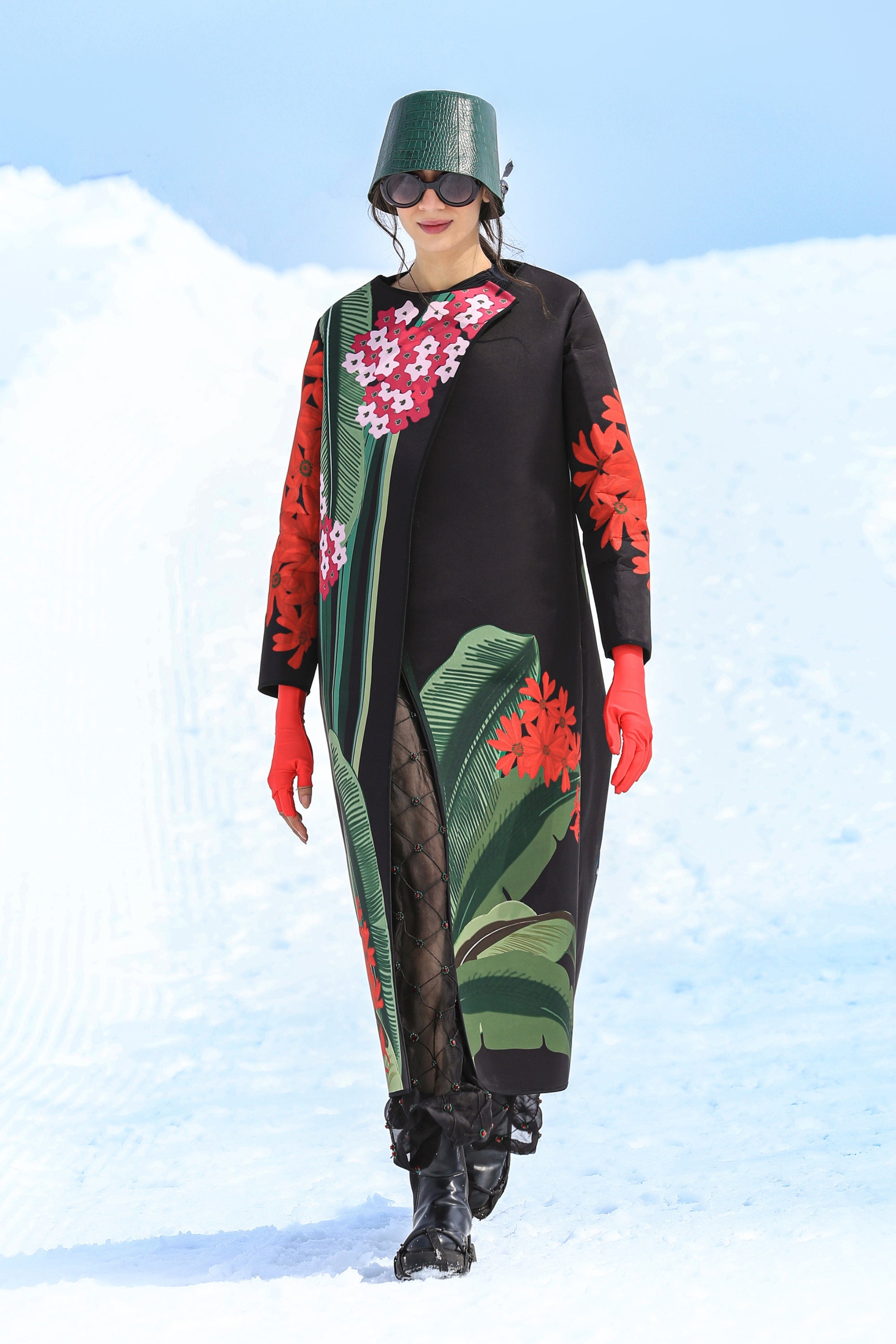 Crafted from lustrous stretch satin and fused for a sharp, structured silhouette, this statement piece features sakura blooms against deep noir taken from the iconic Palmera art print. The innovative fabrication offers a modern, avant-garde shape that blends artistic impact with wearable luxury.