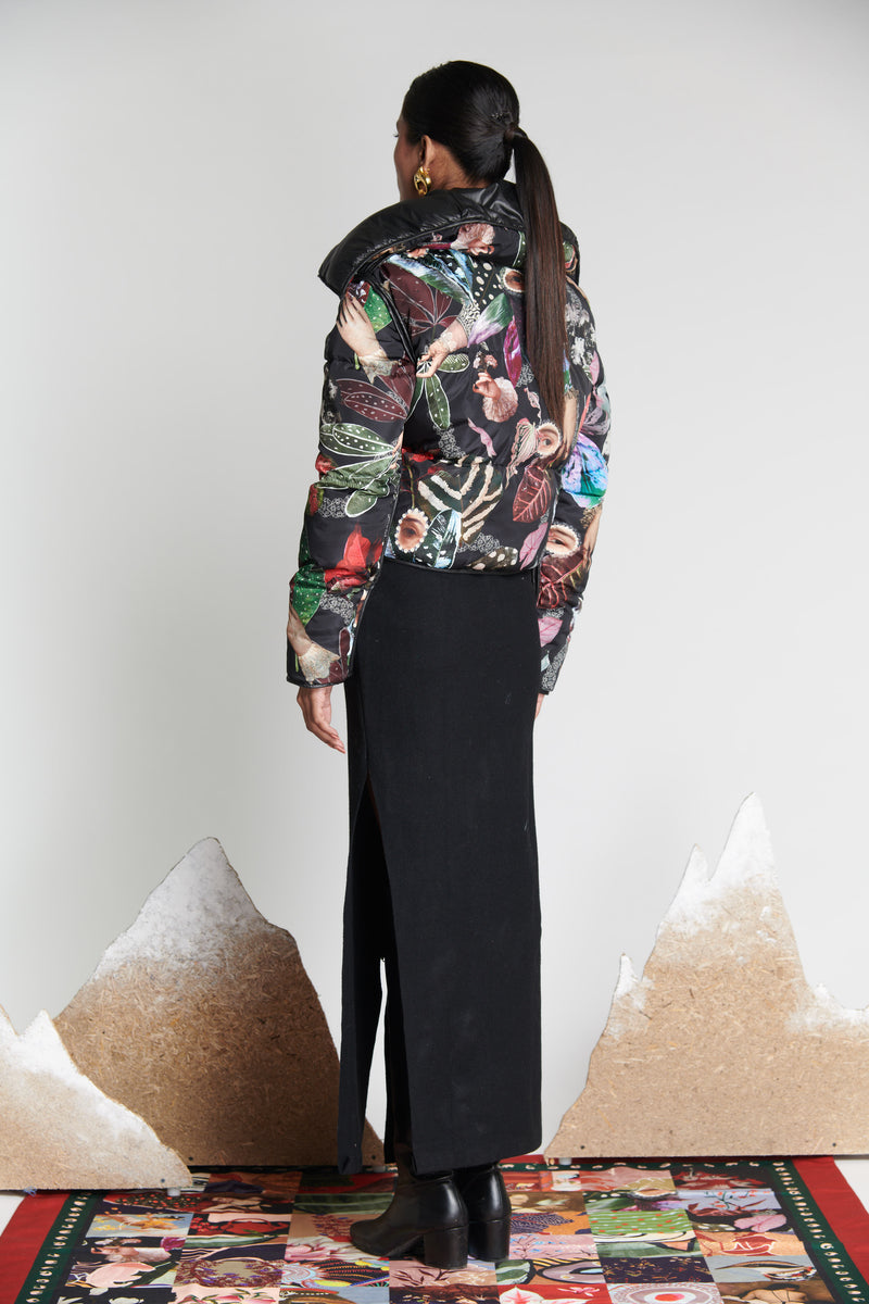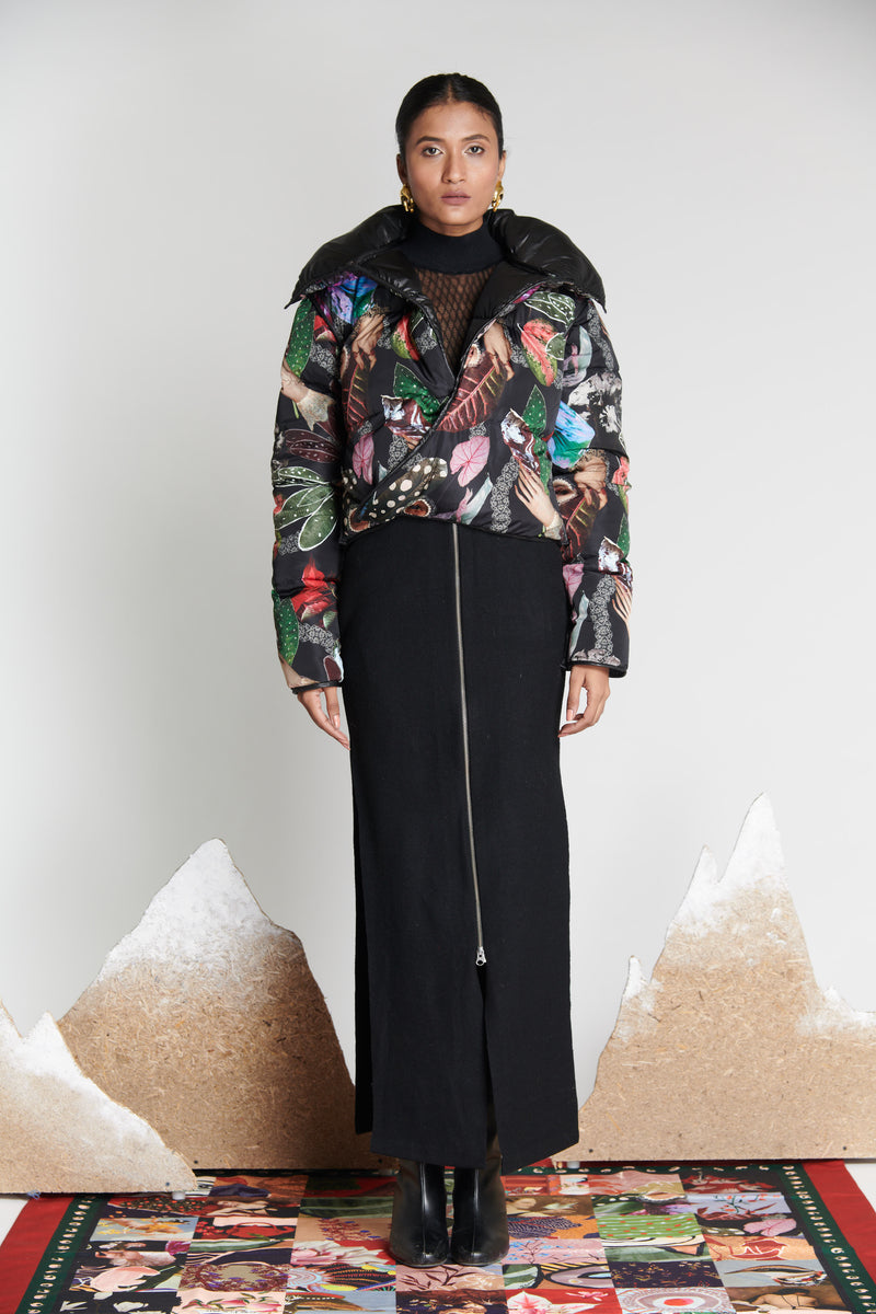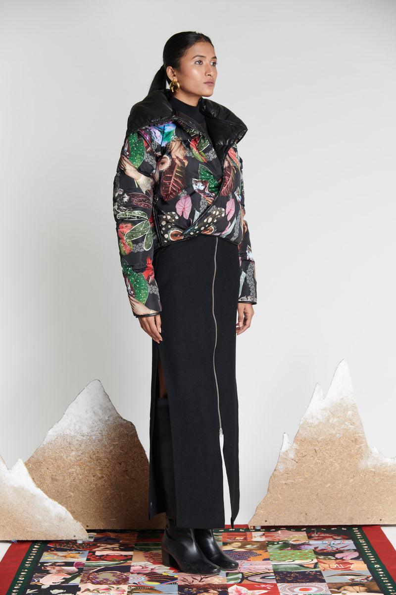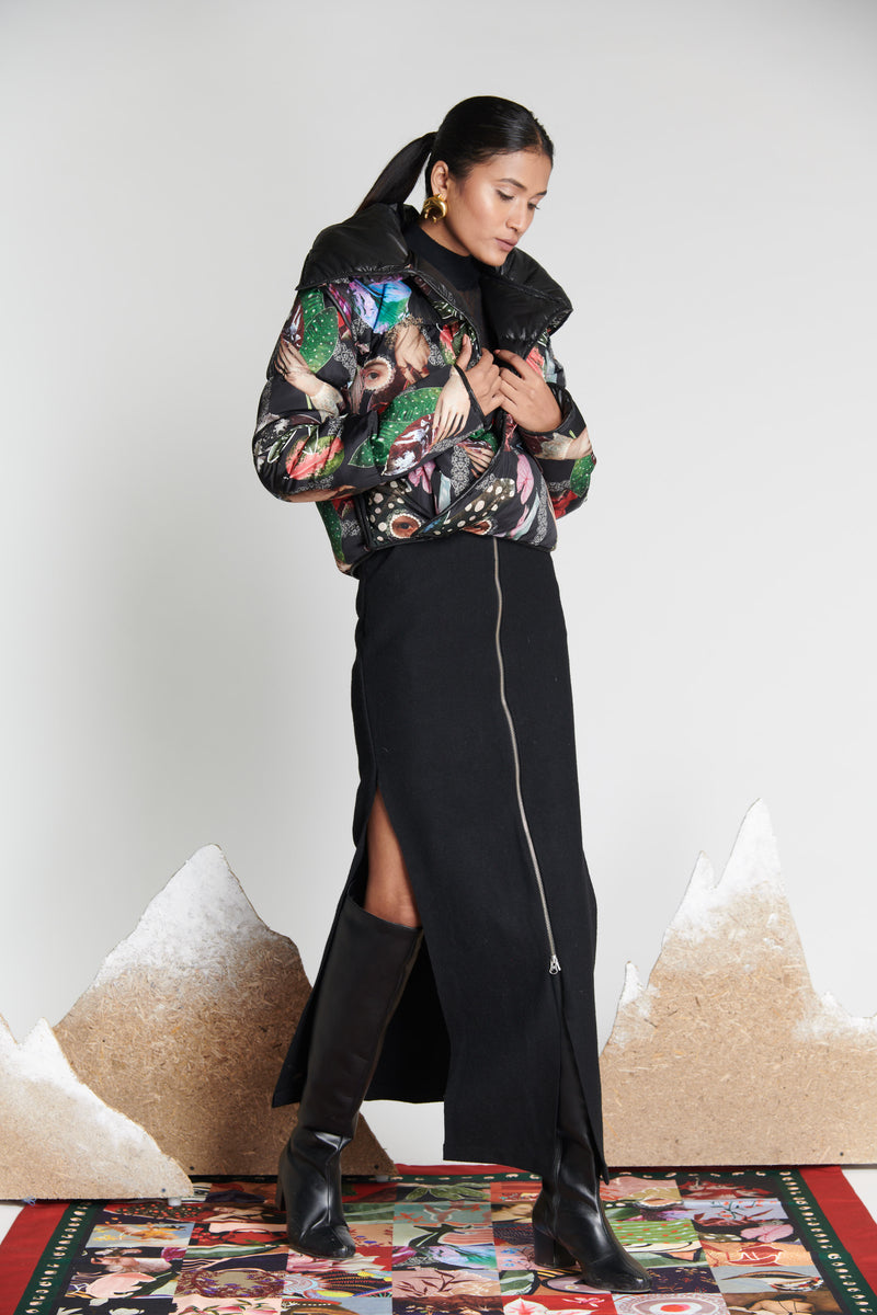 Rendered in a classic form-fitting silhouette, the Noir Woollen Felt Skirt is designed with a high-rise elasticated waist and a zip fastening detail in the front. Pair with a coordinating knit and a printed puffer jacket of your choice.