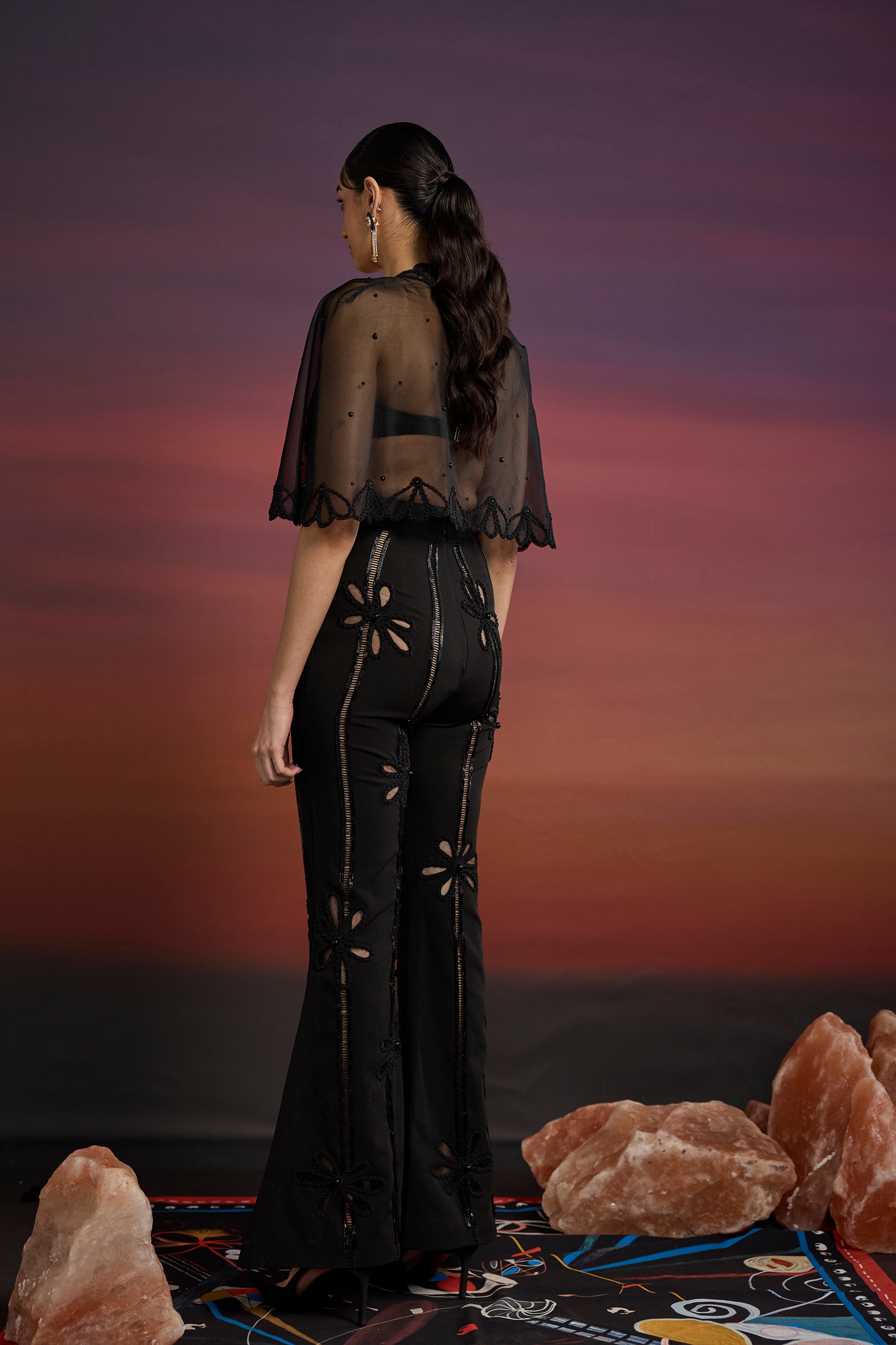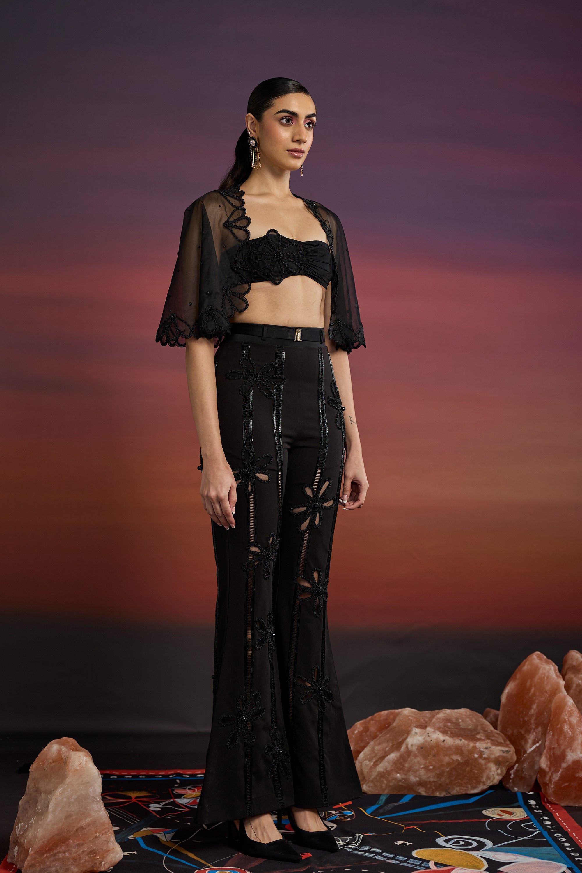 Crafted in sheer silk organza, this embroidered cape features intricate floral detailing with delicate bead accents. Designed for effortless layering, it adds ethereal elegance and fluid movement. Style with the matching embroidered trousers to create a bold, head-turning statement look that transitions effortlessly from sunset soirées to glamorous city evenings.