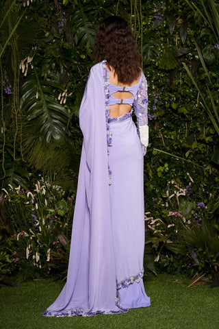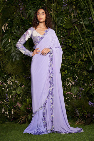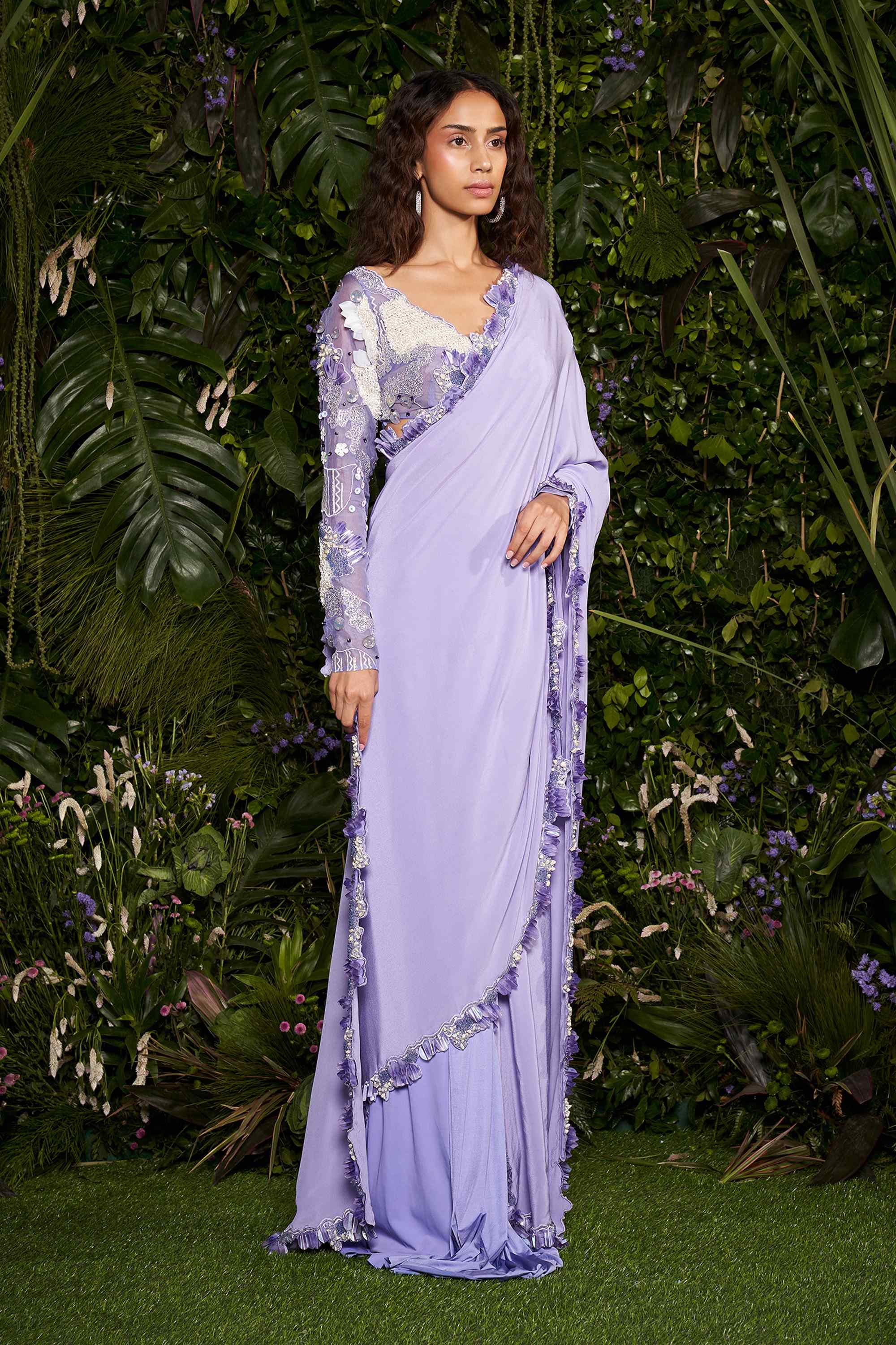 An effortless embrace of craftsmanship creates relaxed silhouettes and sartorial fantasies embellished with precious motifs, handcrafted resin skeinwork on the borders which makes a versatile statement with a periwinkle blouse that features delicate threadwork with luxurious ostrich feathers for a striking celebration appearance.