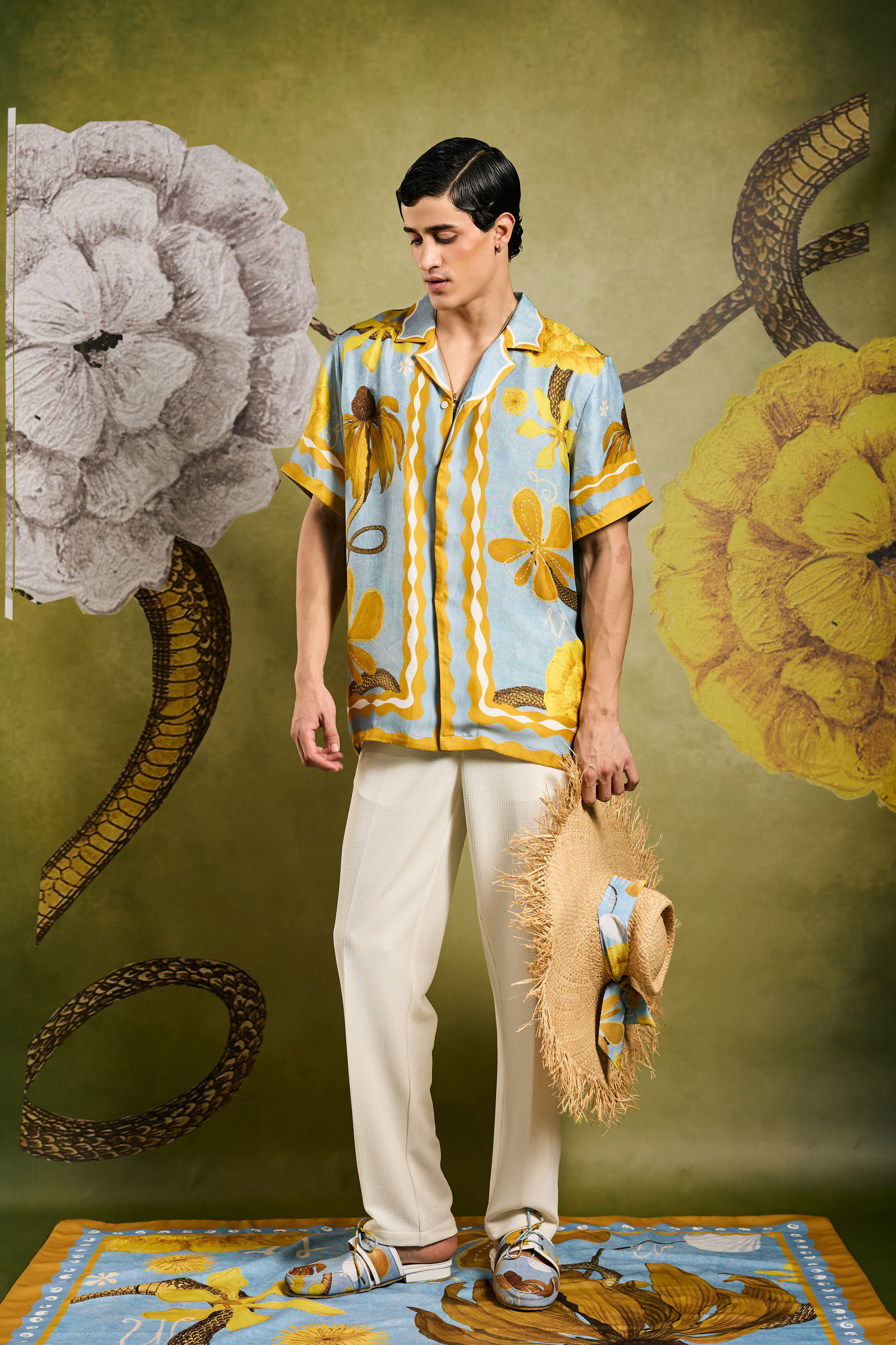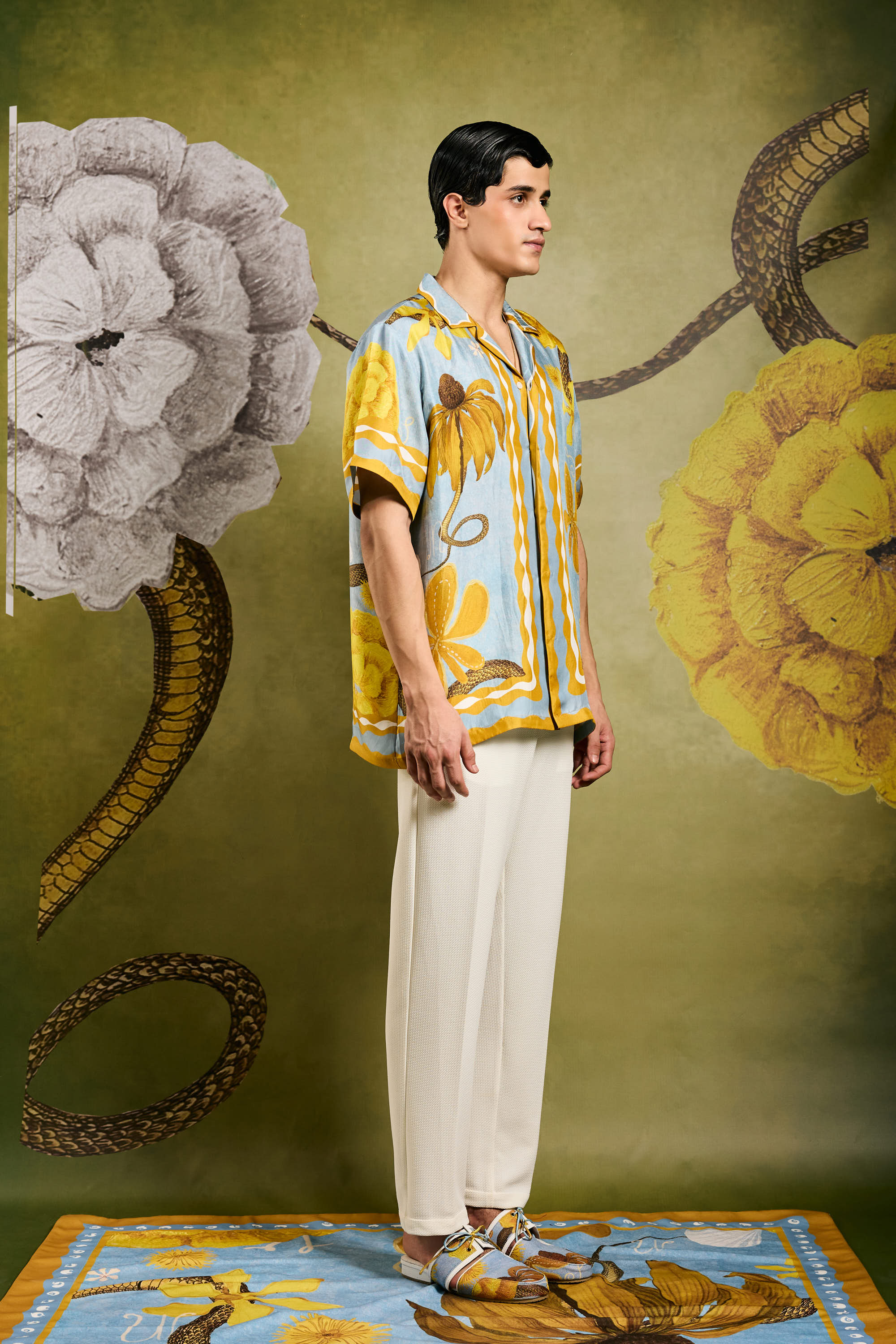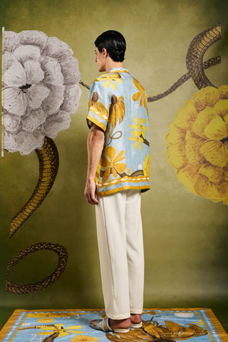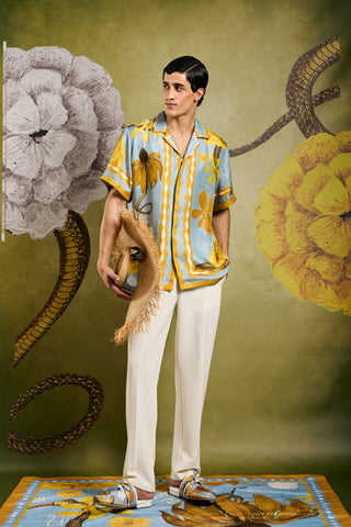 Crafted from softest silk, this statement button up resort shirt features the Primordi print inspired by divinity soaked works of the artist, Hilma Af Klint. The print balances striking botanical elements in serene verdant tones, making it an essential addition to any vacation wardrobe.