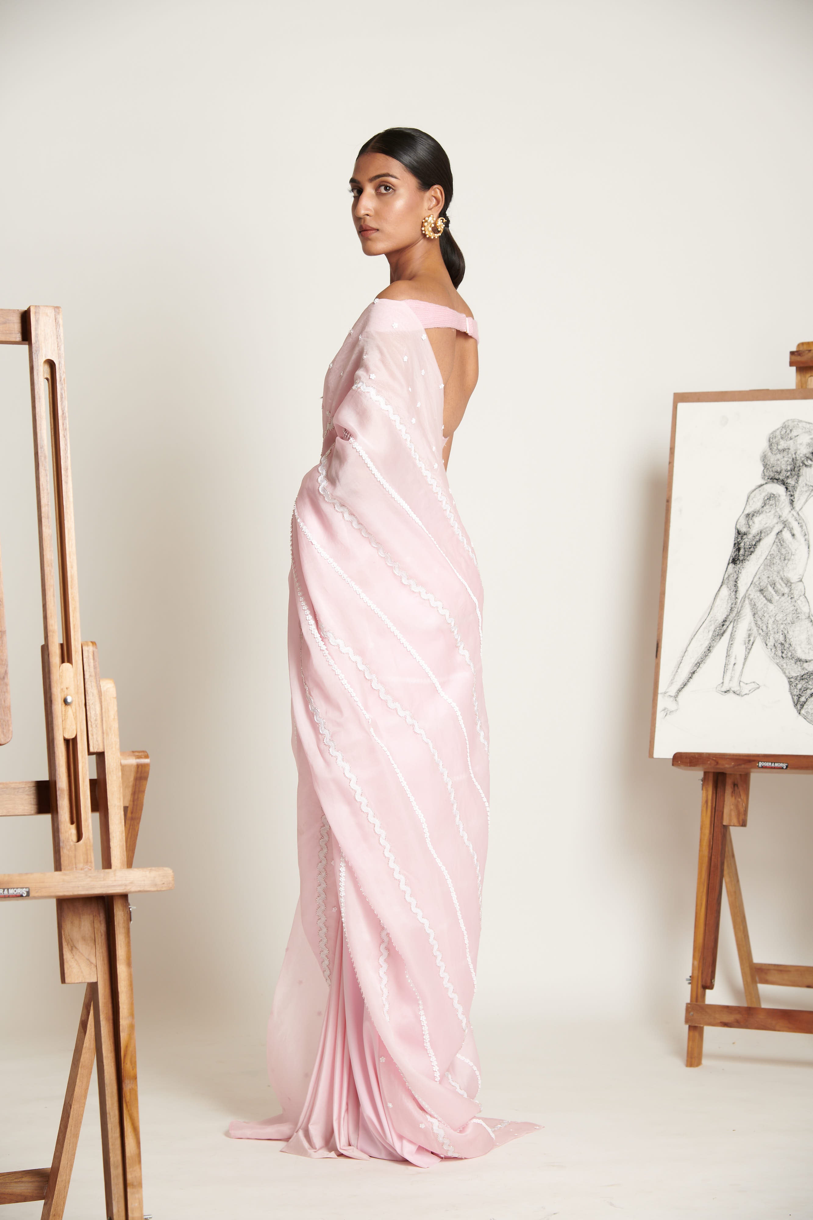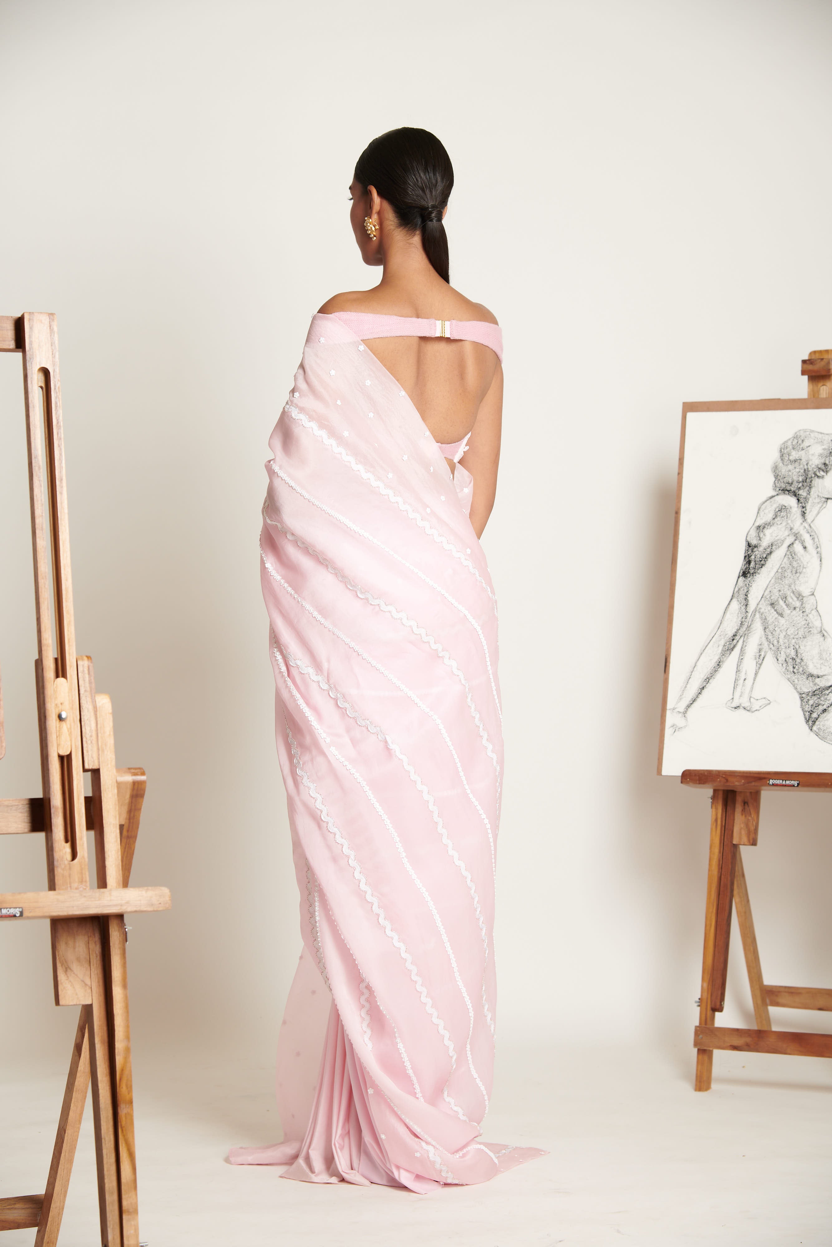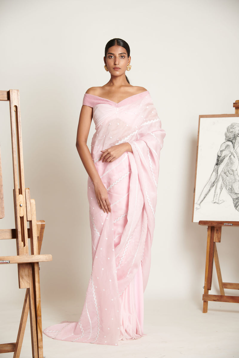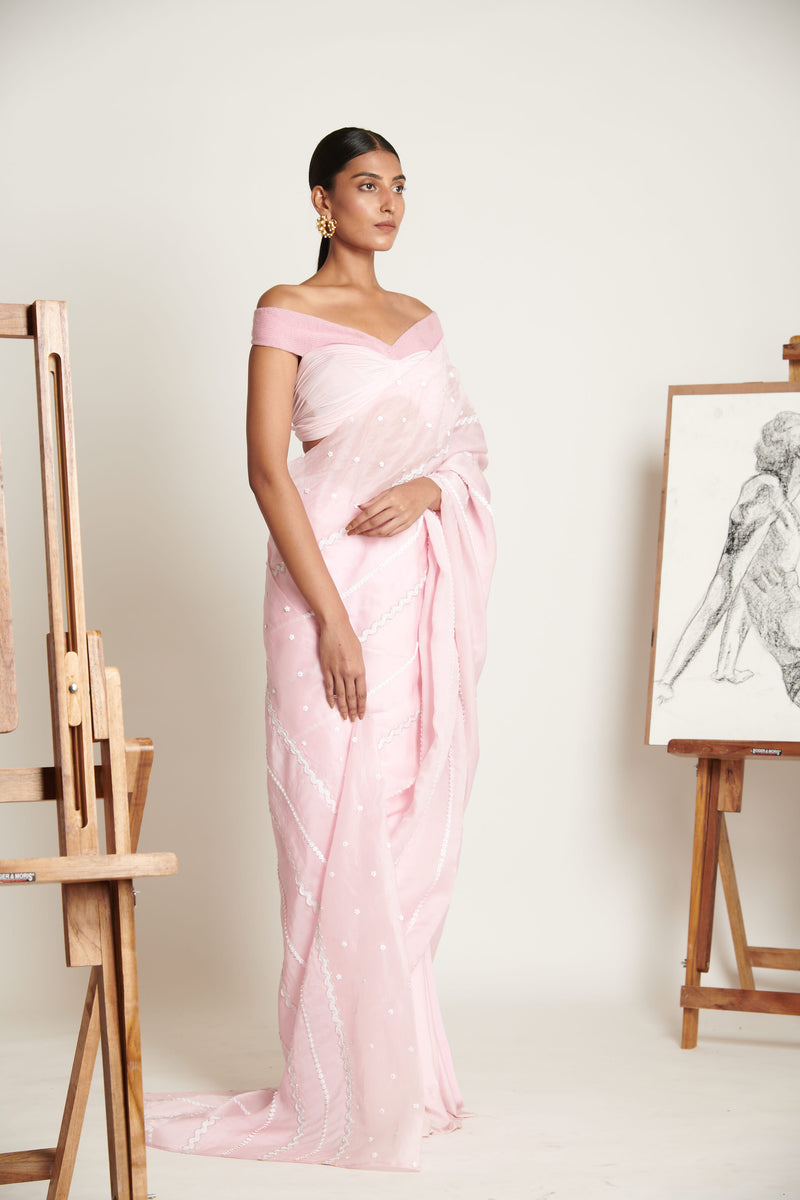 Emanating elegance and a decadent sense of charm, the Couture Sari features handcrafted chevron pattern skein and 3d floral applique grazing its plush pink surface. Finished to perfection in gazar silk and paired with a two-tone delicately ruched blouse, the look assumes functionality with tasteful exuberance.