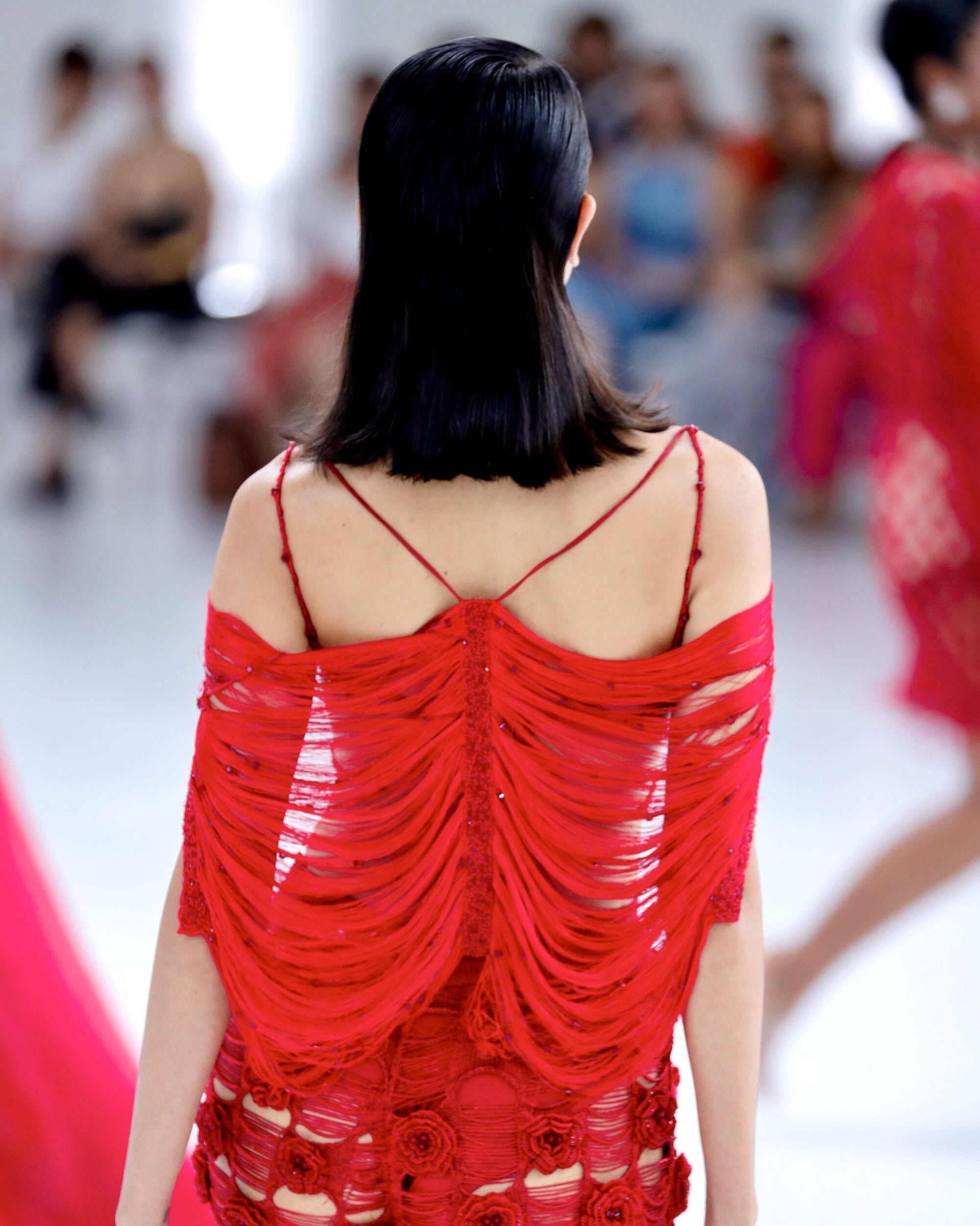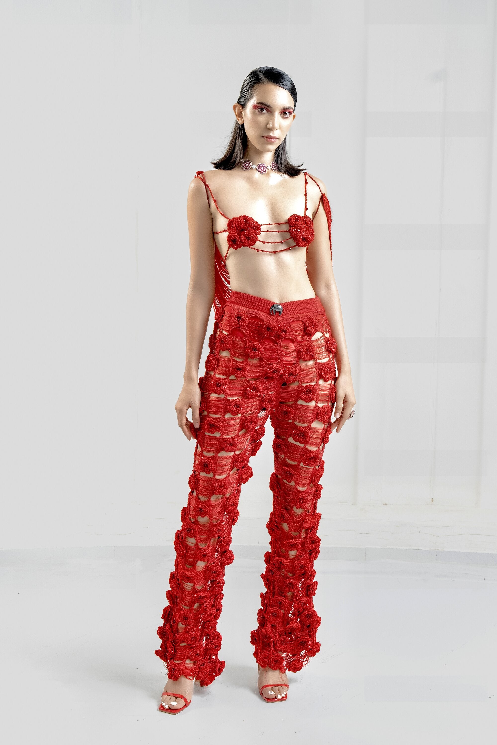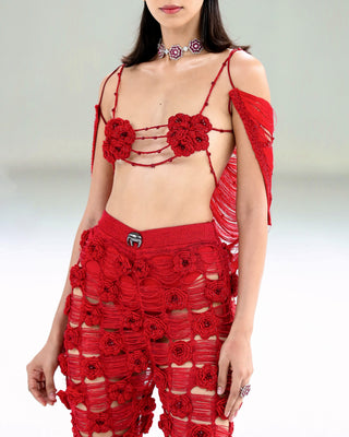 Redefining classic glamour and femininity, the set features hand-knitted pants adorned with crochet flowers and an embellished bustier sculpted with hand crochet flowers. The look is finished with the meticulously crafted thread cape, a striking statement piece unto itself.