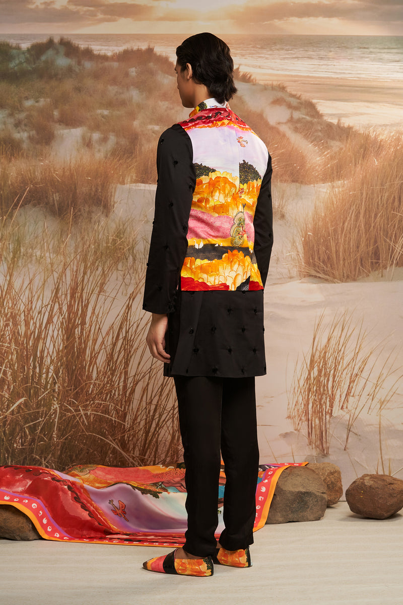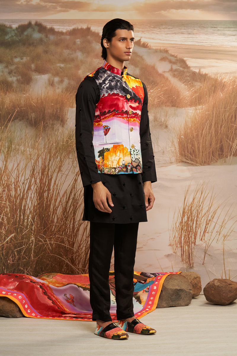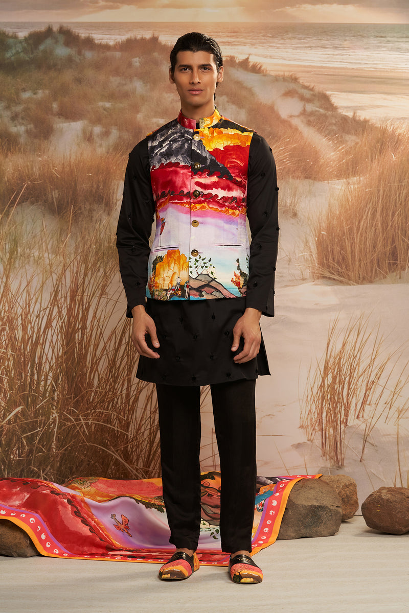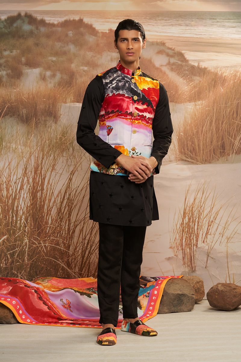 Envisaged for the dapper man, Solscape Classic Bandi is characterised by traditional silhouette galvanized with the vibrant signature print and luscious fabric. An eclectic addition to festive wardrobes, it is cut to comfortably layer over Kurtas or Polos.