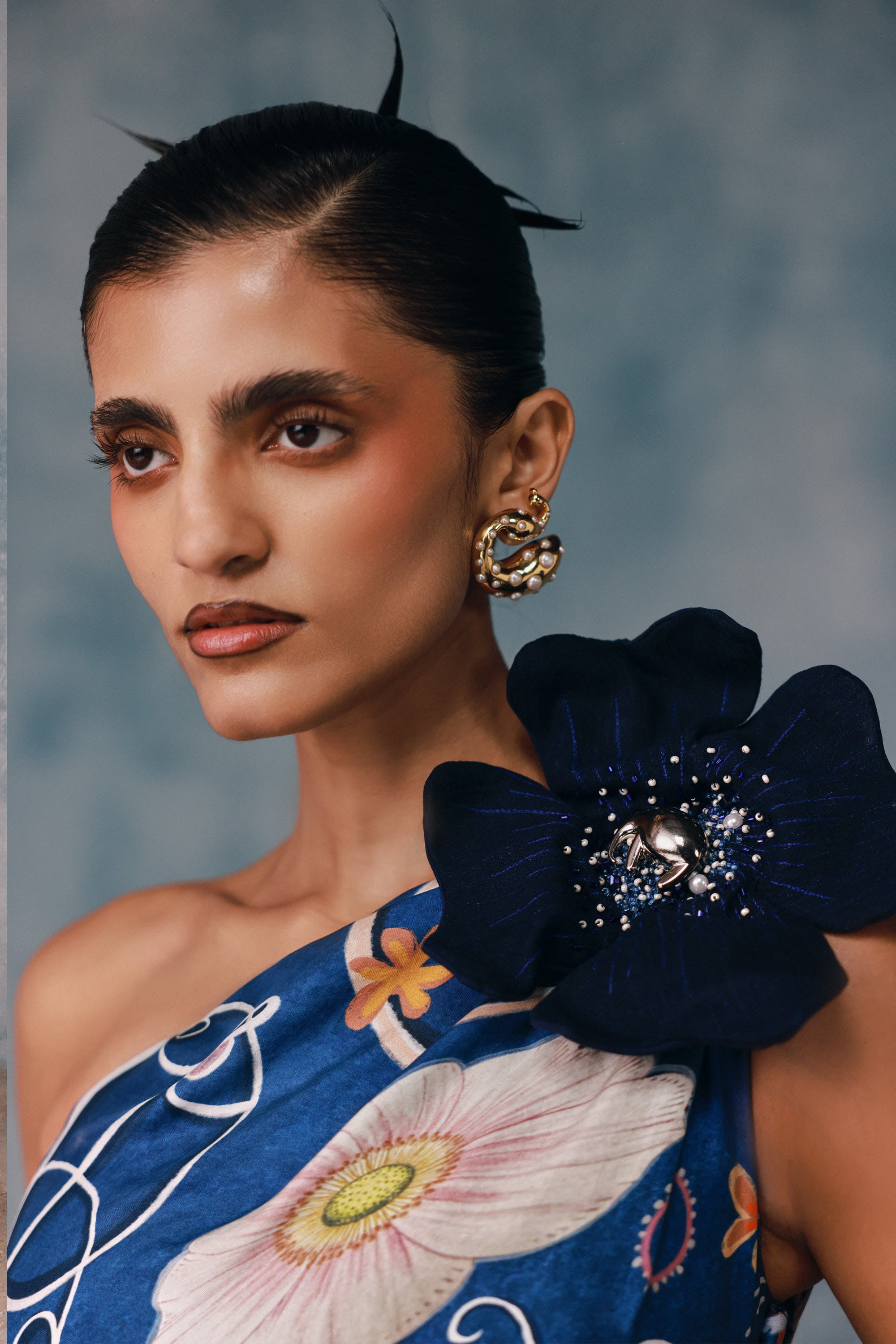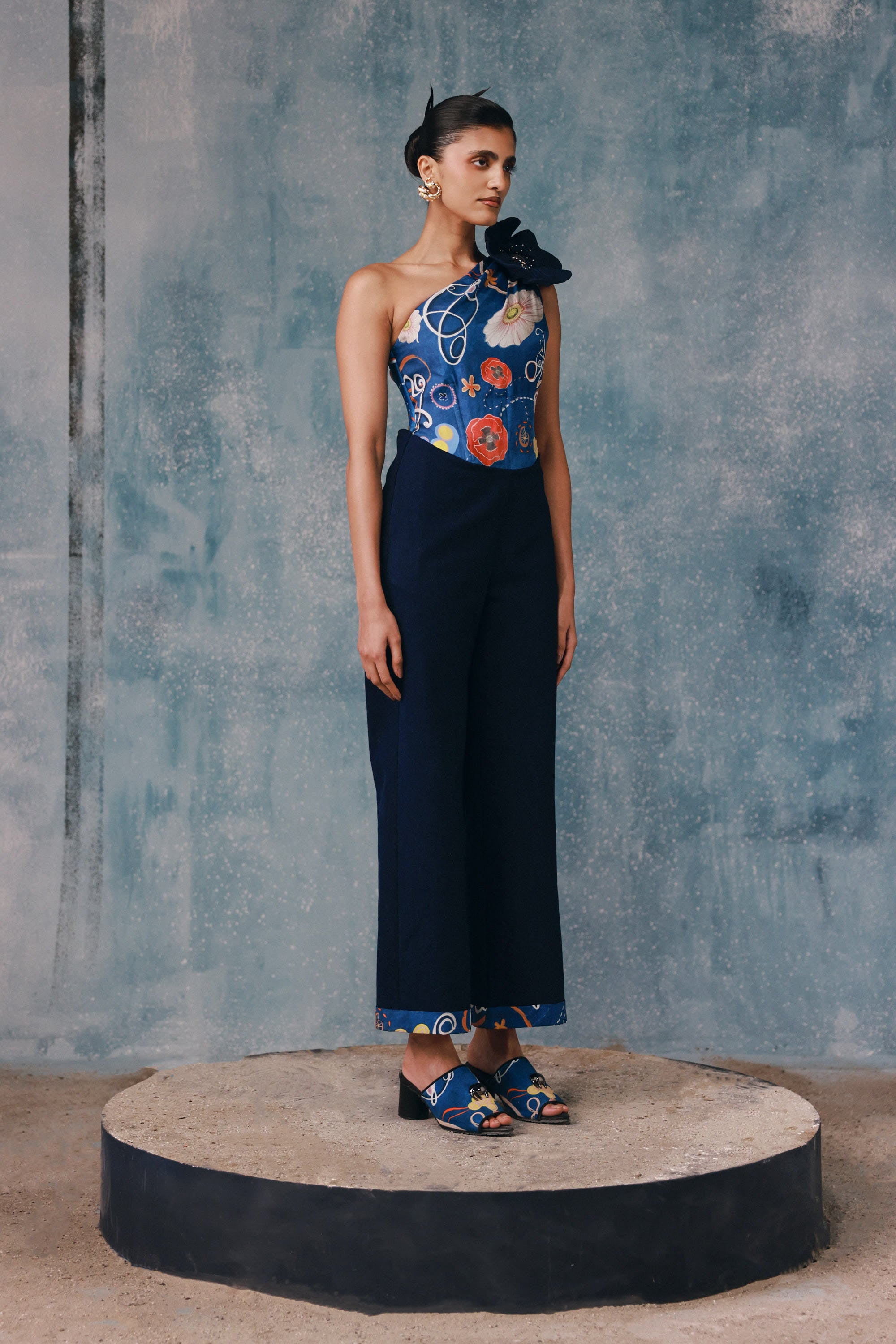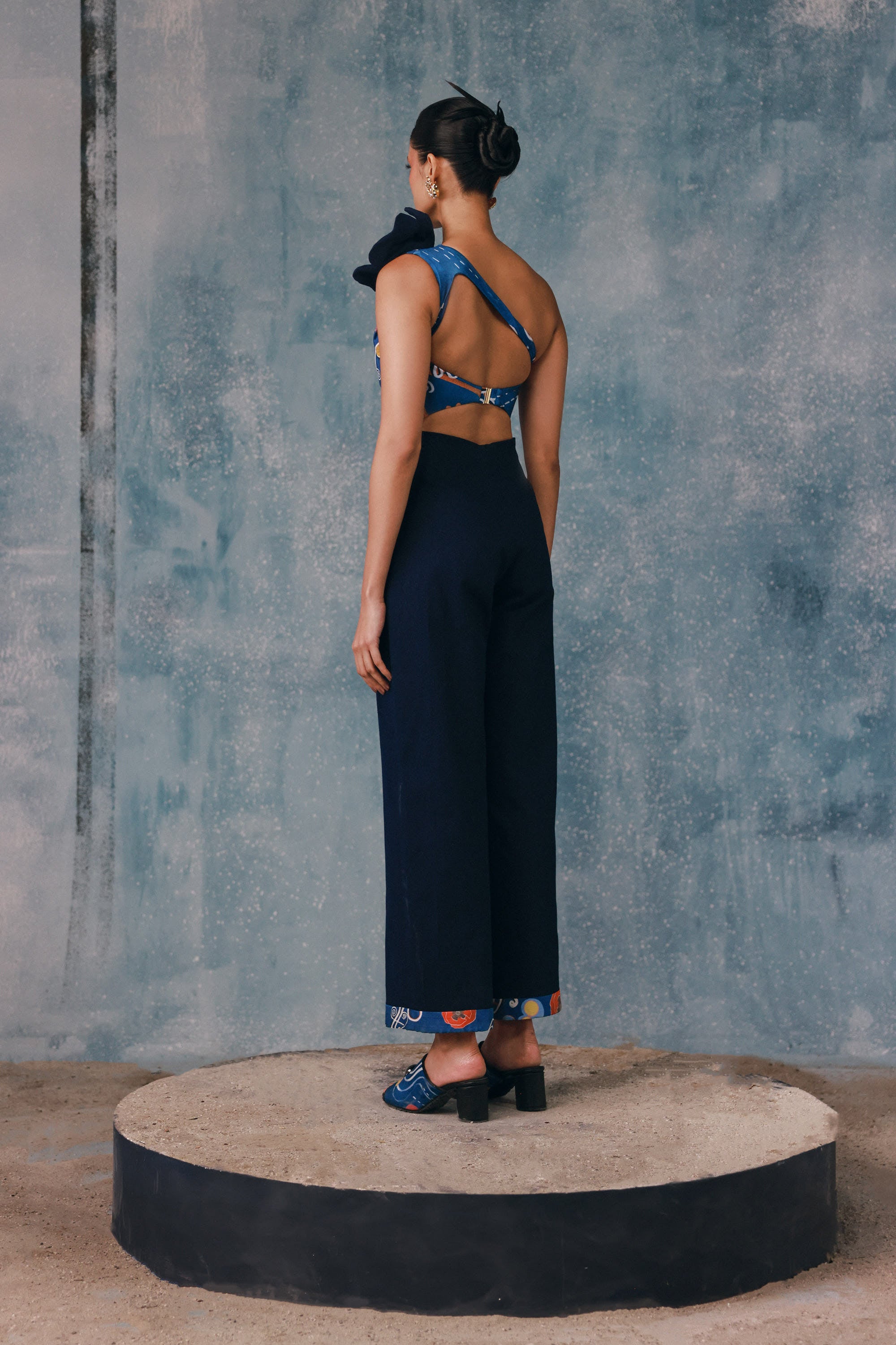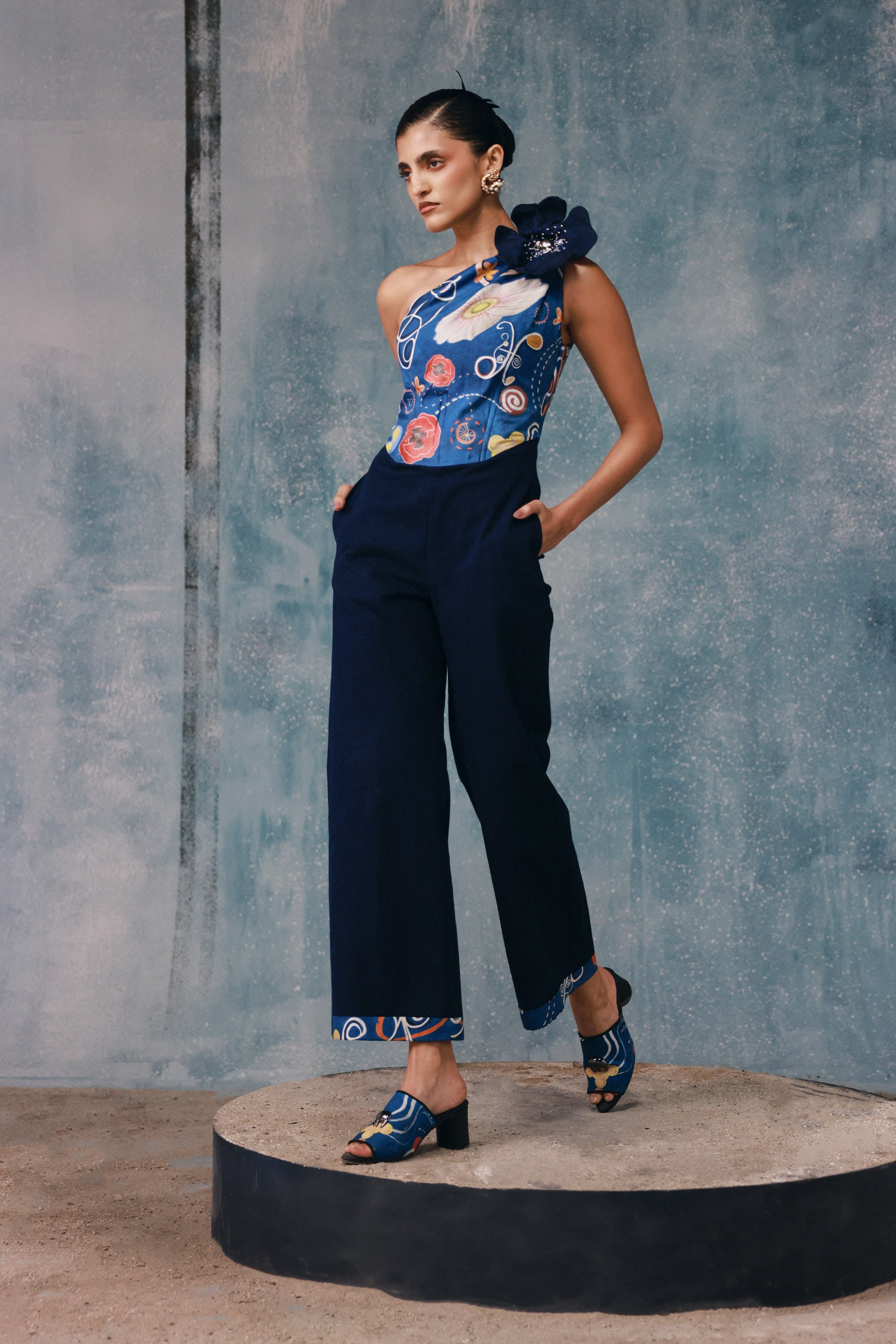 Defined by sculptural draping and an asymmetrical neckline, this jumpsuit delivers understated drama. Crafted for fluid movement and an elongated silhouette. Style it with bold jewellery for elegant resort evenings.